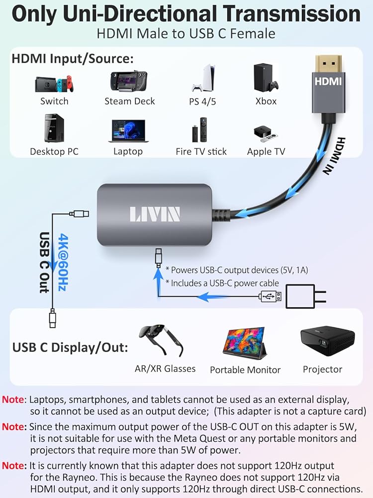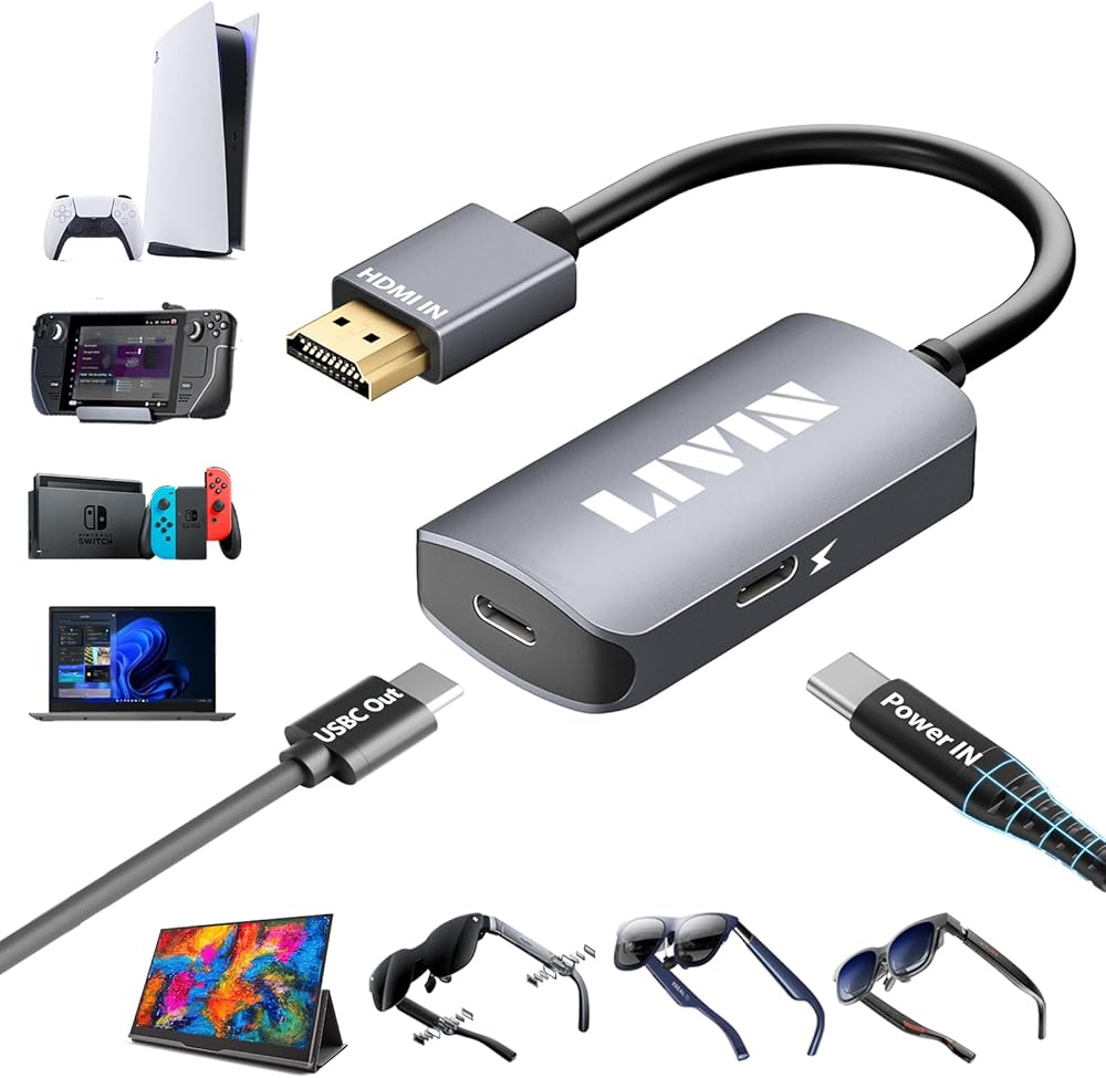 محول نظارات LIVIN AR XREAL/Rokid/VITURE/RayNeo، HDMI إلى USB C 【4K@60 هرتز+منفذ شحن】، التوصيل والتشغيل، غلاف من الألومنيوم HDMI إلى النوع C، شاشة محمولة، كمبيوتر شخصي، مفتاح، ROG Ally، Steam Deck، PS4 /5، إكس بوكس