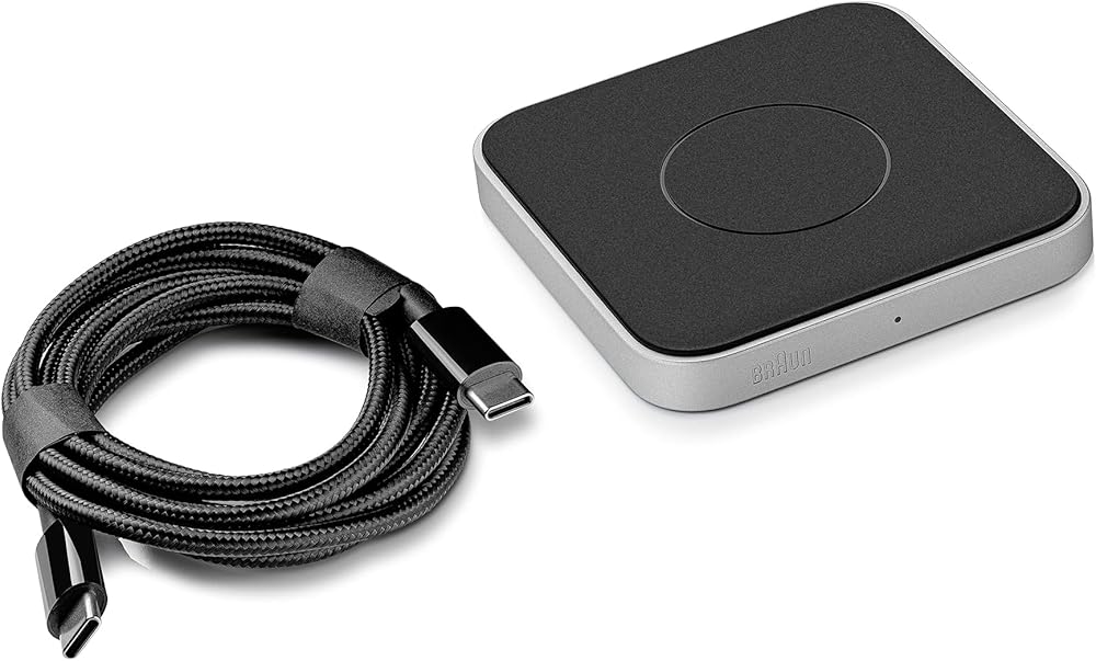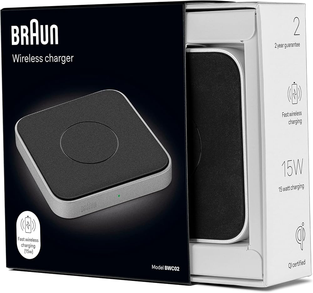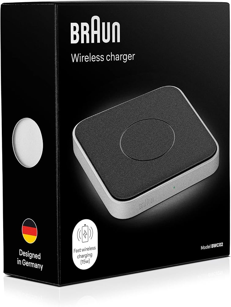 Design is at the heart of Braun: The concept of ‘less, but better' has its origins in the Bauhaus movement, but it was Braun and Dieter Rams that created a mind-set of order, clarity and simplicity and applied it to electrical appliances. For six decades, Braun's humanistic approach to design has inspired designers and companies around the world. Description: This slim magnetic wireless charger allows for 15W fast-charging and is compatible with MagSafe products. It features a green LED status light that gives information about the charging staus an dims to a low level after 60 seconds. The charger requires a power adaptor to function (NOT INCLUDED) and comes with a braded Type-C charging cable. Features: Up to 15W charging capacity (7.5W with iPhone) Compatible with MagSafe prodcuts Green LED status light Additional information: 2 year guarantee Requires power adaptor (NOT INCLUDED) Box contains: 1x Braun magnetic wireless charger 1x Type-C charging cable 1x Instruction & warranty card