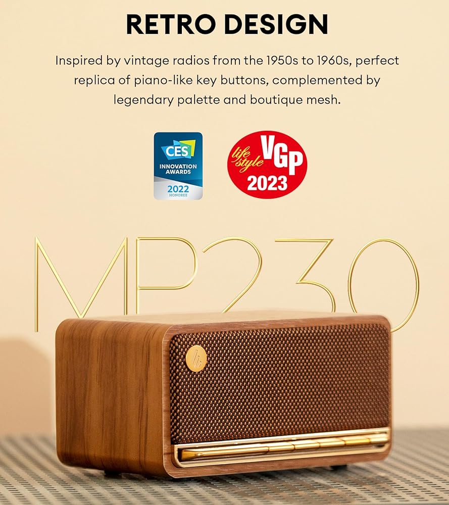 【أناقة حنين، ابتكار مشهور】مستوحى من أجهزة الراديو في فترة الخمسينيات والستينيات من القرن الماضي، يتميز هذا التصميم بأزرار دقيقة على طراز البيانو، ولوحة ألوان خالدة، وشبكة حرفية. حاز على جوائز CES وVGP المرموقة، فهو يمزج بسلاسة بين الذوق الكلاسيكي والأداء الصوتي الفائق.