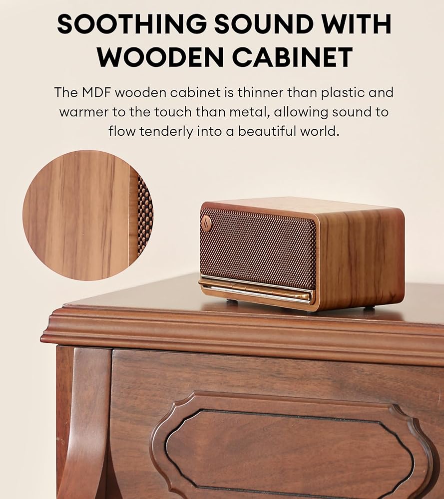 【واجهة بديهية وخزانة خشبية للصوت الهادئ 】جرب التفاعل السهل مع أدوات التحكم في مفتاح البيانو والغلاف الخشبي الذي يبدو أكثر دفئًا من البلاستيك أو المعدن. يجمع هذا التصميم بين البساطة ولمسة الطبيعة، ويغلف كل نغمة بدفء لطيف قبل أن يتحول إلى مشهد صوتي هادئ.