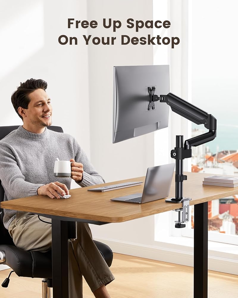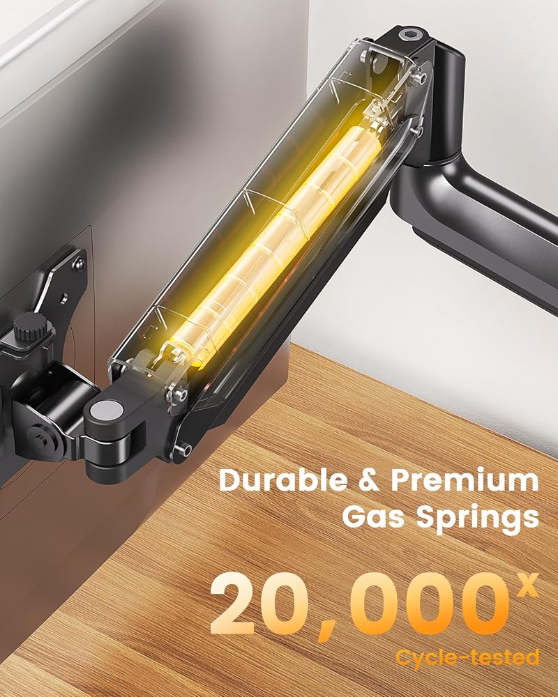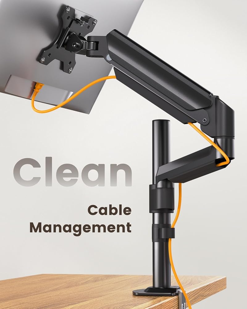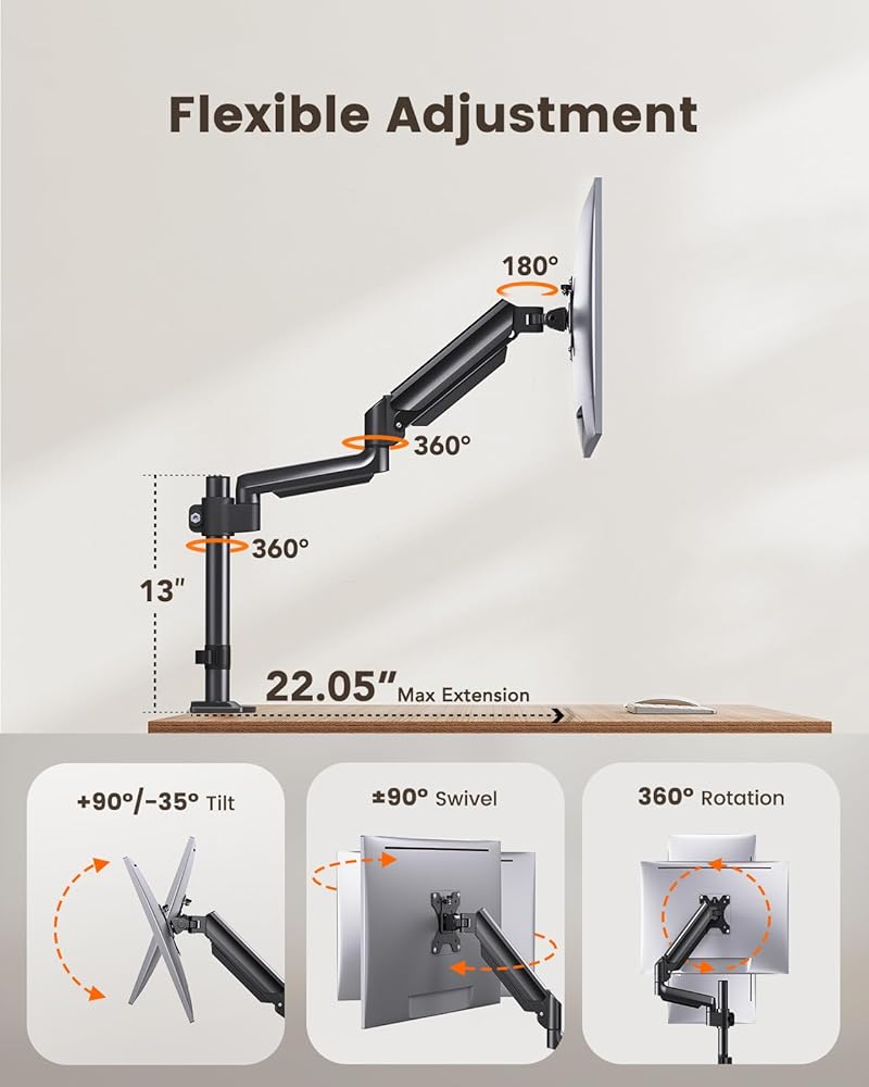 قابل للتعديل بالكامل: استمتع بالراحة والمرونة المطلقة مع حامل الشاشة الفردي القابل للتعديل هذا. تتميز بإمالة 90 درجة لأعلى، و35 درجة لأسفل، ودوران 180 درجة، يمكنك بسهولة العثور على زاوية الرؤية المثالية. استخدم الدوران 360 درجة لاختيار الوضع الأفقي أو العمودي أو تمديد الذراع 22.05 بوصة لتقريب شاشتك للحصول على رؤية أكثر وضوحًا.