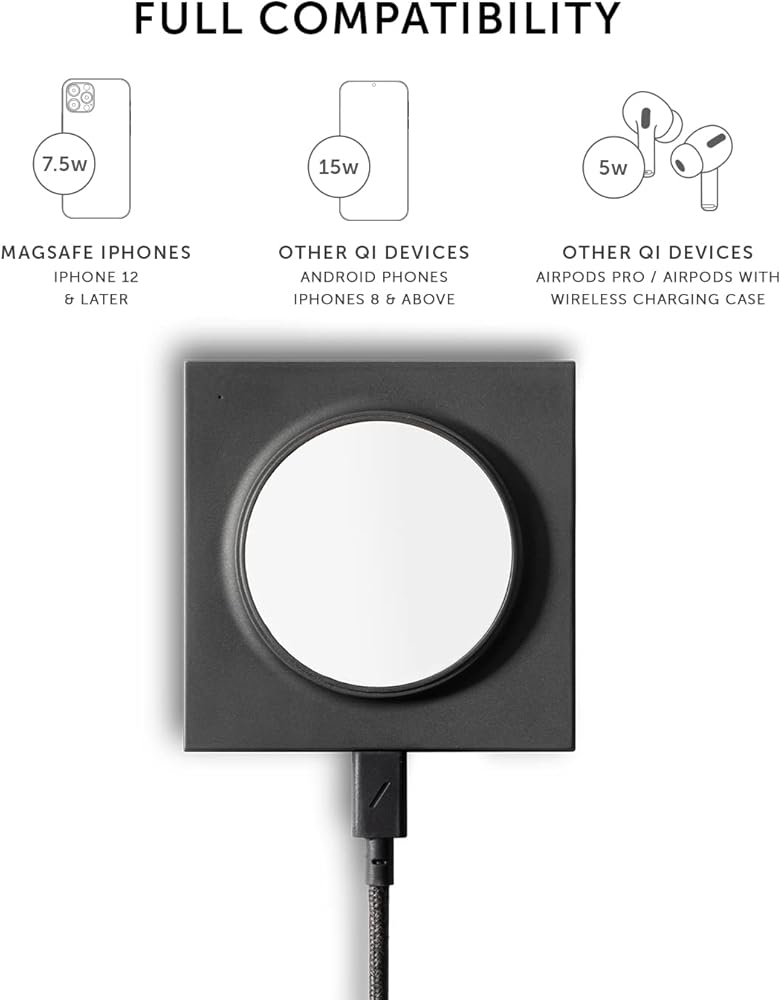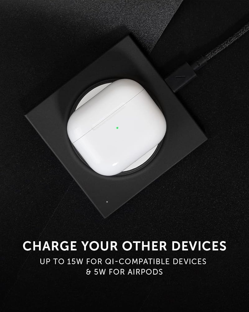 - شحن عالمي: يشحن أيضًا أجهزتك الأخرى المتوافقة مع Qi (بدون محاذاة مغناطيسية) حتى 15 وات. AirPods Pro، Airpods Pro 2، AirPods Gen 1-3 مع علبة شحن لاسلكية (حتى 5 واط)، iPhone 8 إلى iPhone 15 (حتى 7.5 واط)، Google Pixel 7/7 Pro، Samsung Galaxy S23، S23 Plus، S23 Ultra وون بلس 8 برو والمزيد.