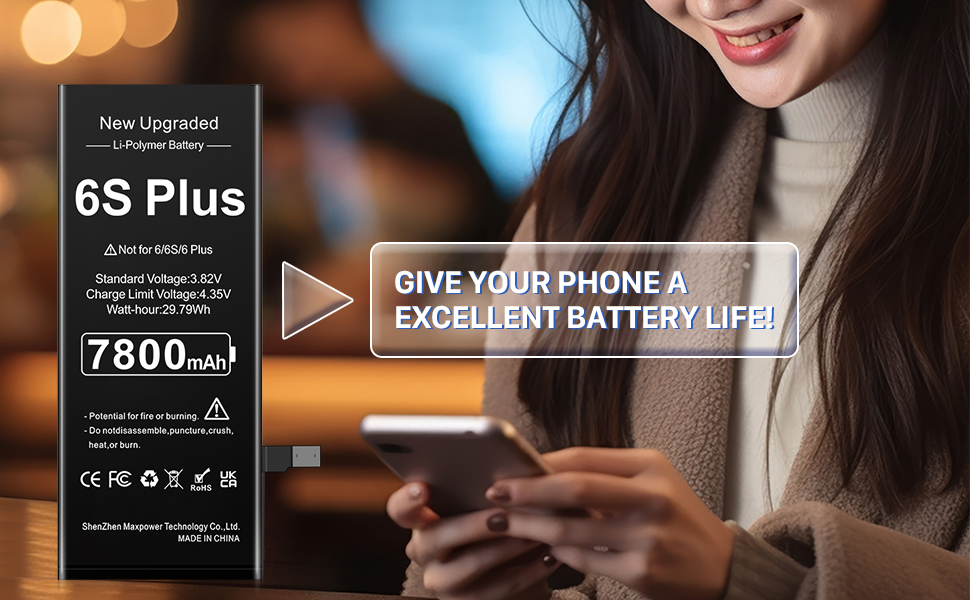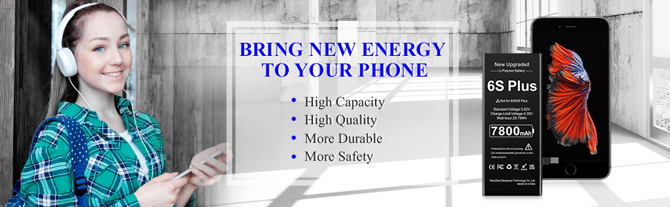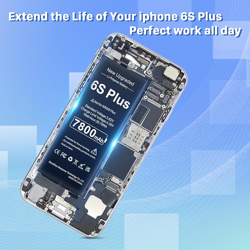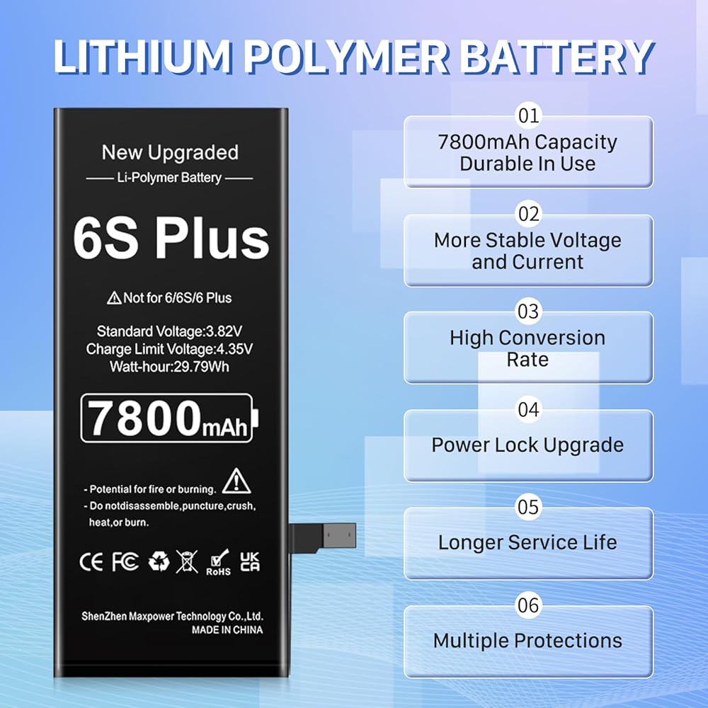 ✴︎(عمر بطارية طويل): بطارية بديلة عالية السعة لجهاز iPhone 6s plus، نوع البطارية: ليثيوم أيون، سعة البطارية: 7800 مللي أمبير، واط/ساعة: 29.79 وات في الساعة، خرج الجهد: 3.82 فولت. دورة 0 جديدة تمامًا، مصممة لتدوم ما يصل إلى 1200 دورة شحن لتوفير عمر بطارية أطول. أعد عمر بطارية iPhone 6s plus موديل A1634، A1687، A1690، A1699 إلى المجد.