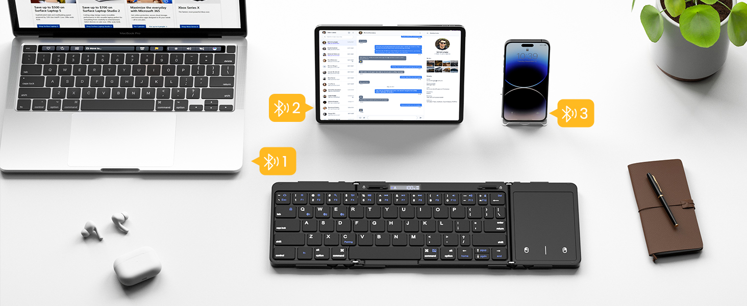 • 【مزامنة ما يصل إلى 3 أجهزة】 قم بإقران ما يصل إلى 3 أجهزة في وقت واحد والتبديل بينها بسهولة. تعامل مع مهام أو جداول متعددة بشكل منفصل على Android/ Mac OS/ Windows. بالإضافة إلى ذلك، تحتوي لوحة المفاتيح المحمولة على مفاتيح تشغيل سريعة مثل السطوع والبحث وتعدد المهام ورفع مستوى الصوت وخفضه والتشغيل/الإيقاف المؤقت وكتم الصوت وما إلى ذلك، وهي سهلة الاستخدام وتعمل على تحسين كفاءة العمل. إنه مثالي لرحلات العمل والمكاتب المنزلية والسيناريوهات الأخرى.