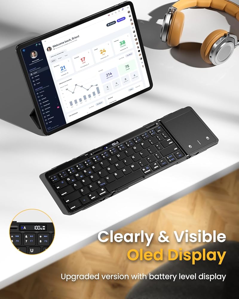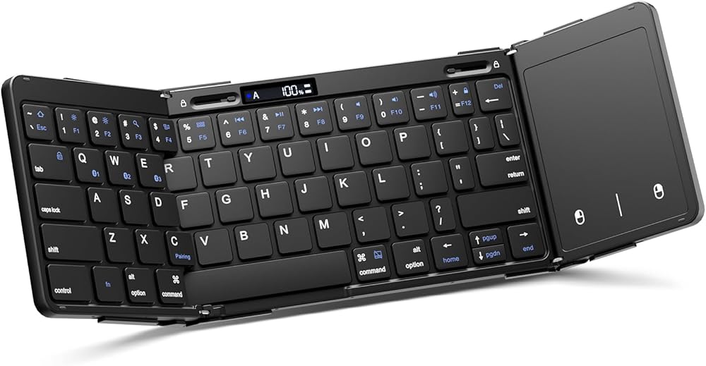 لوحة مفاتيح بلوتوث قابلة للطي، لوحة مفاتيح محمولة كاملة الحجم قابلة للطي مع لوحة لمس، شاشة عرض البطارية ومفصلة قفل، لوحة مفاتيح لاسلكية للسفر لنظام التشغيل Windows iOS Android والكمبيوتر اللوحي والهواتف الذكية والكمبيوتر المحمول