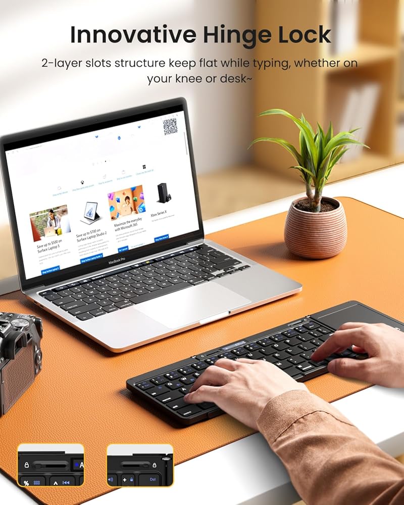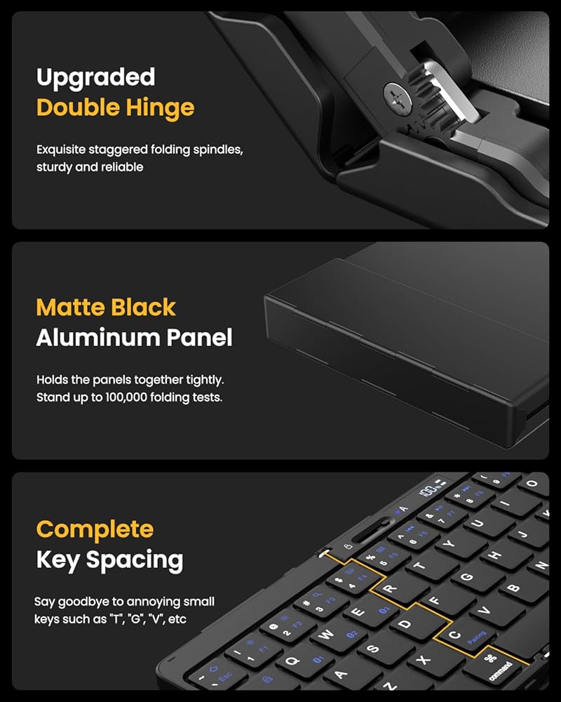 • 【قفل مفصلي مبتكر】يضمن تصميم الفتحة المكون من طبقتين أن لوحة المفاتيح القابلة للطي لن تنحني وتظل مسطحة عند الكتابة على ركبتيك. تضمن المفصلات غير الملحومة أن يكون كل مفتاح عبارة عن مسافة قياسية بين المفاتيح وتحافظ على عادات الكتابة المألوفة لديك ~ توفر مفاتيح المقص الهادئة والمستجيبة ذات الحجم المنخفض كتابة سلسة تشبه الكمبيوتر المحمول بكفاءة، استمتع بالكتابة بسهولة ~