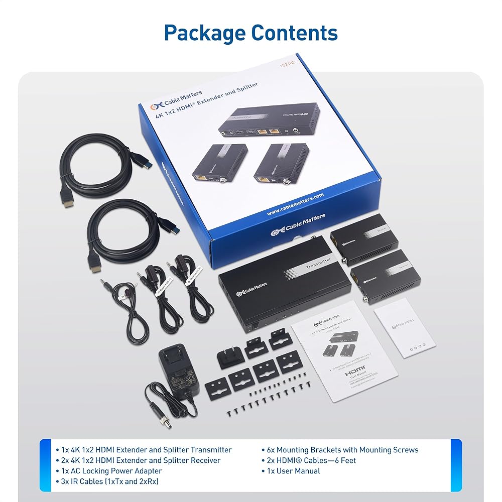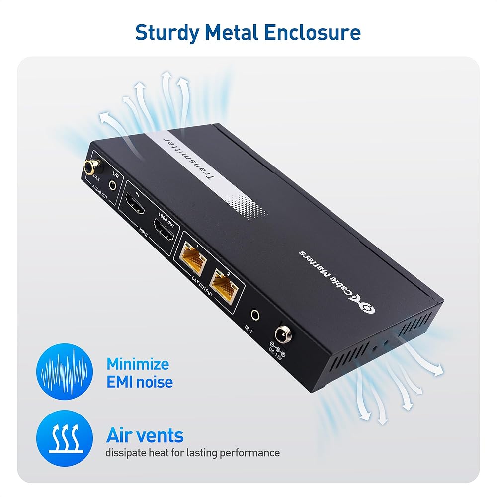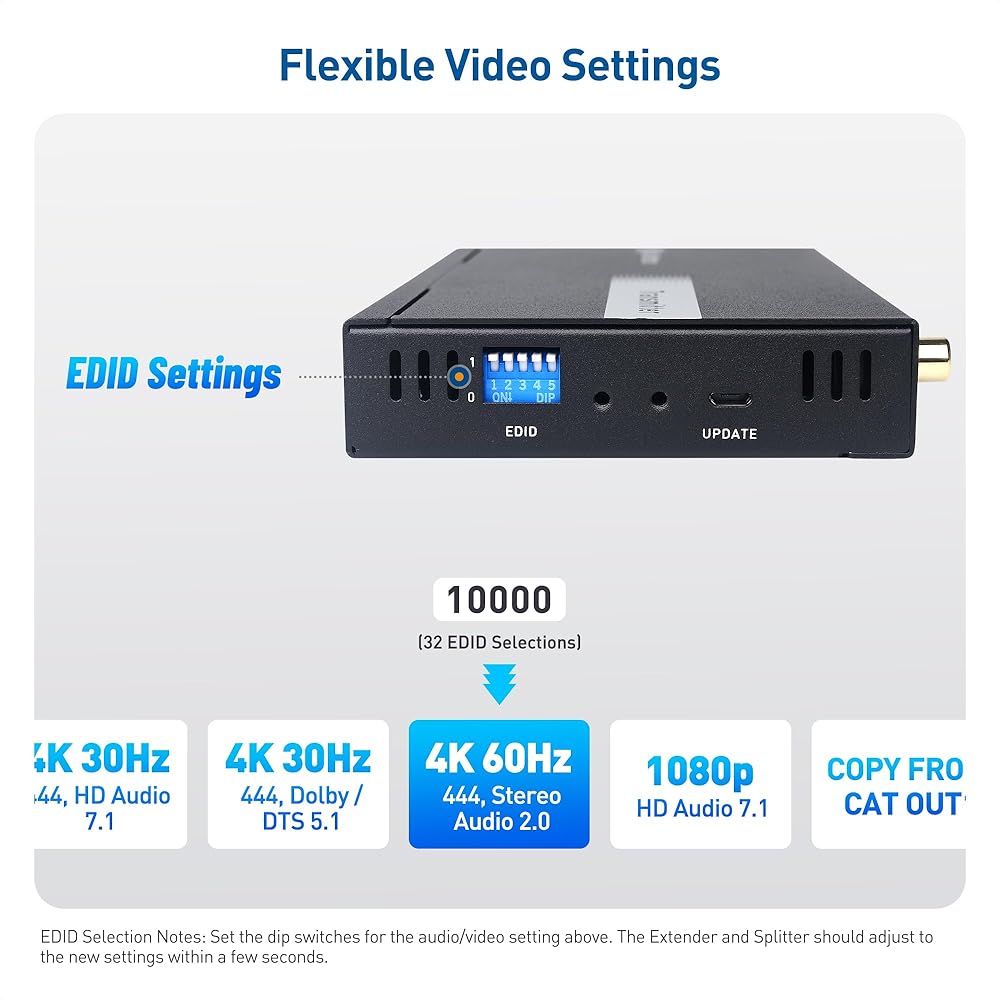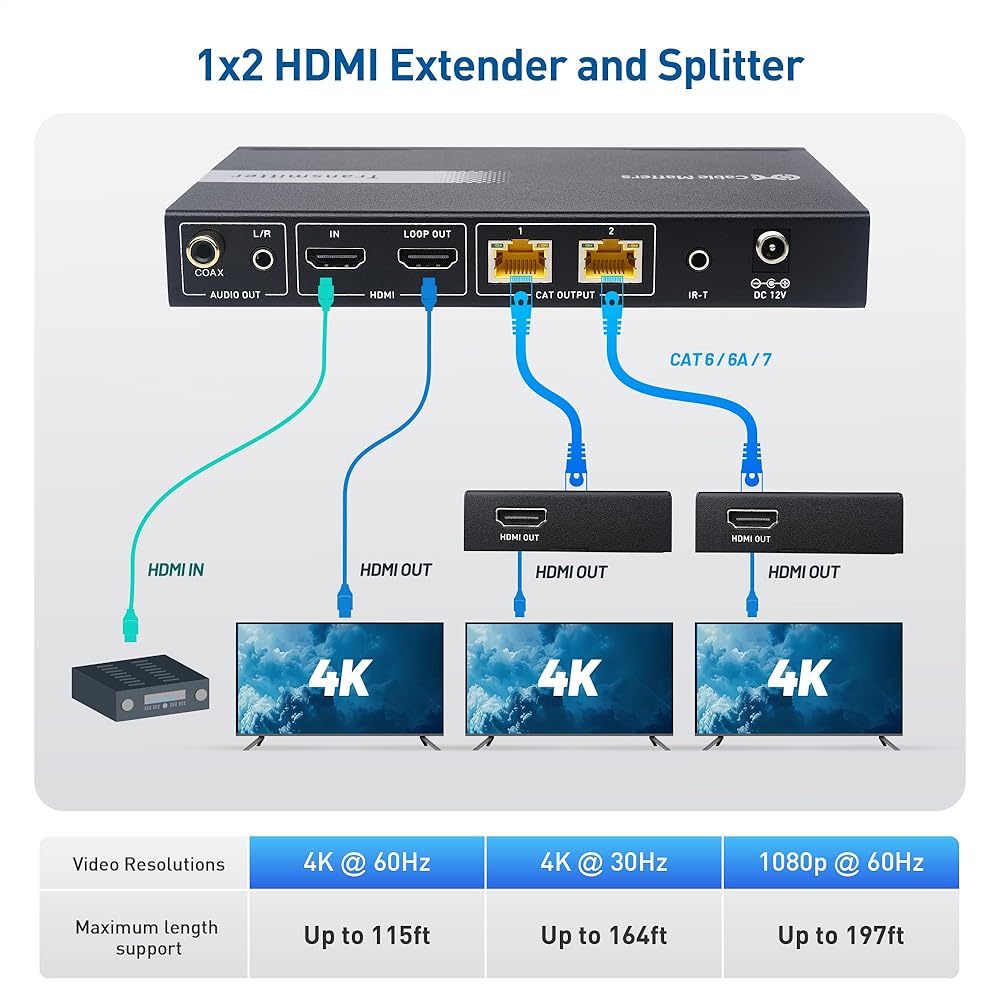 ملحق العرض المزدوج مع Loopout المحلي: قم بتمديد وتقسيم مصدر HDMI واحد إلى شاشتين عن بعد واستخدام HDMI Loopout المحلي لعكس الفيديو على شاشة إضافية. يدعم فيديو 4K@60 هرتز فائق الوضوح حتى 115 قدمًا و1080 بكسل حتى 197 قدمًا، مثالي لإعدادات الشاشة المزدوجة.