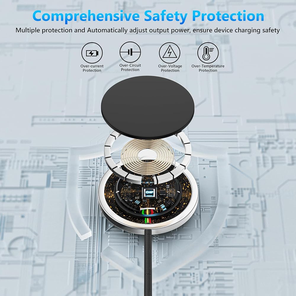 This wireless charging pad for iPhone 15 uses advanced technology to ensure a secured and easy charging experience, preventing the magnetic wireless charger and your phone from overcharging, over current, over voltage, over heating, and short circuit.