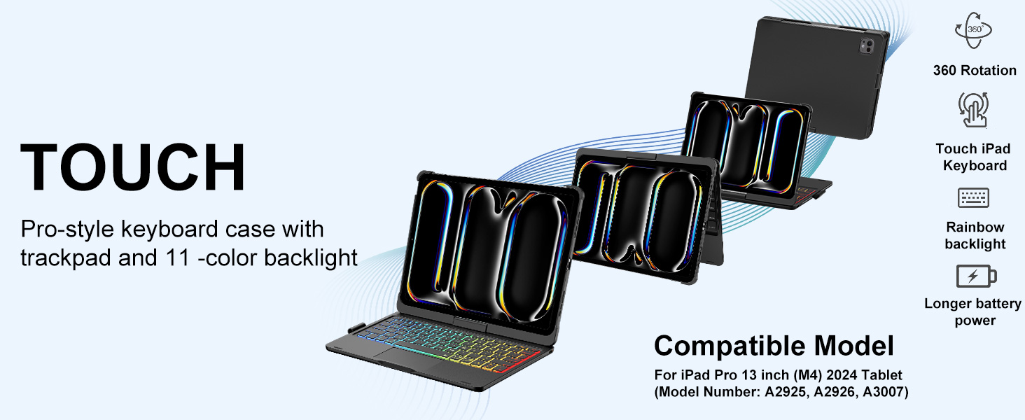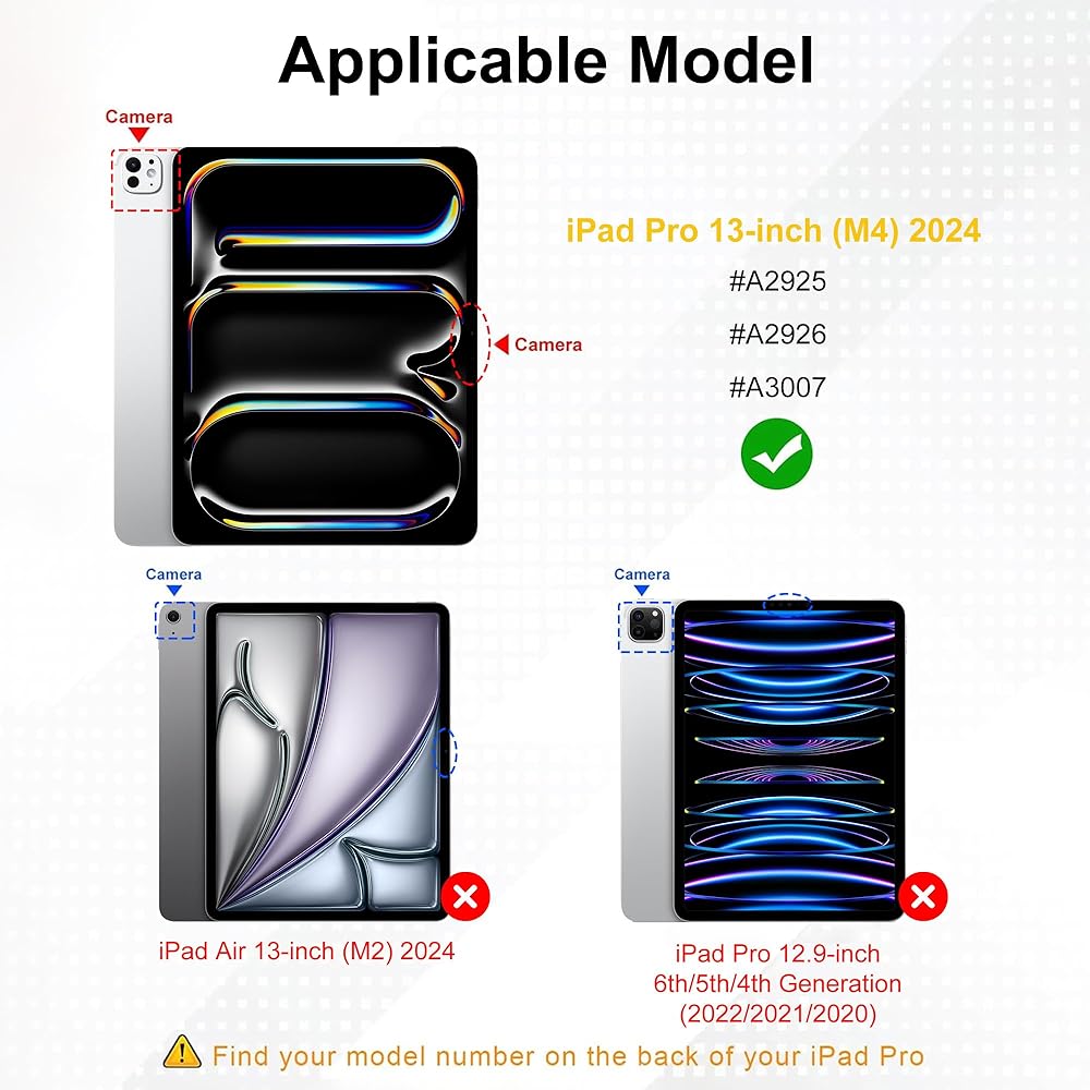 【توافق مثالي】تم تصميم حافظة لوحة مفاتيح iPad هذه خصيصًا لجهاز iPad Pro 13 بوصة M4 2024 إصدار الجيل السابع، (الموديلات: A2925/A2926/A3007) ولن تعمل مع أي طراز جهاز آخر. يرجى التحقق من الجزء السفلي من جهاز iPad الخاص بك للعثور على رقم الطراز.