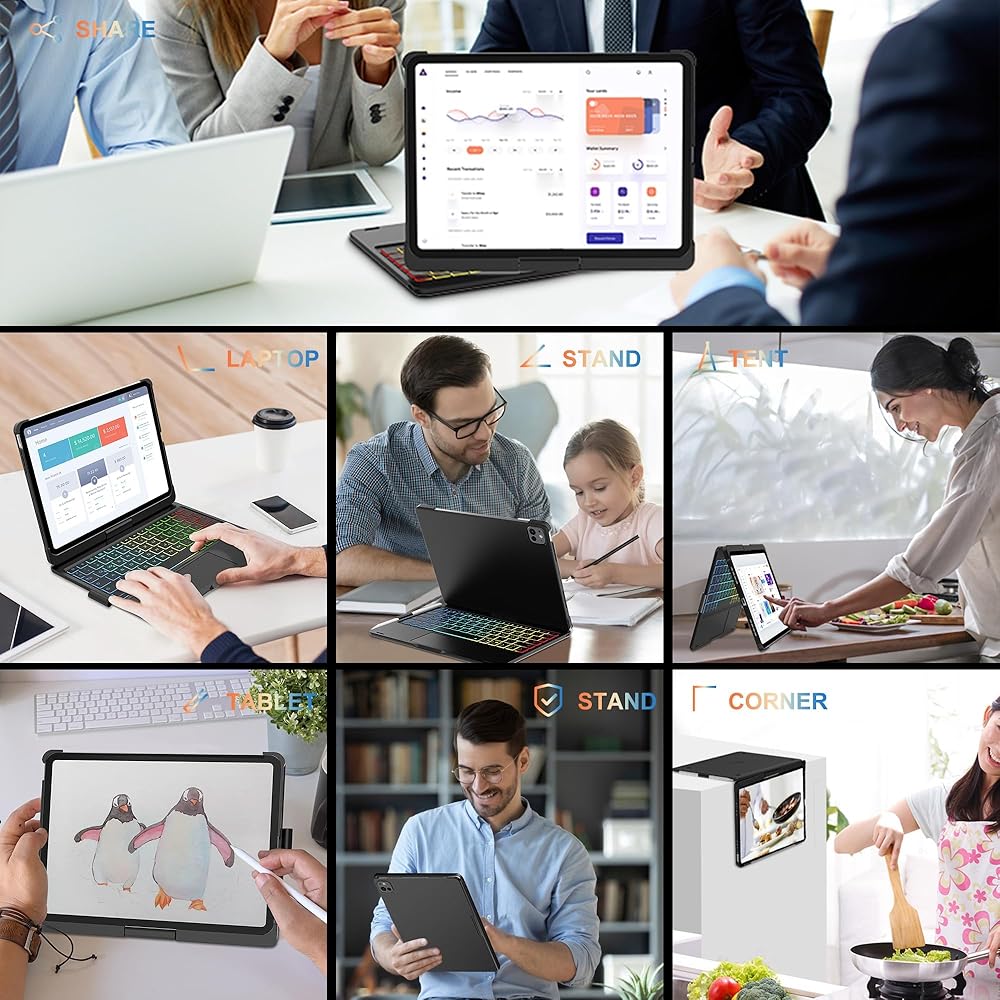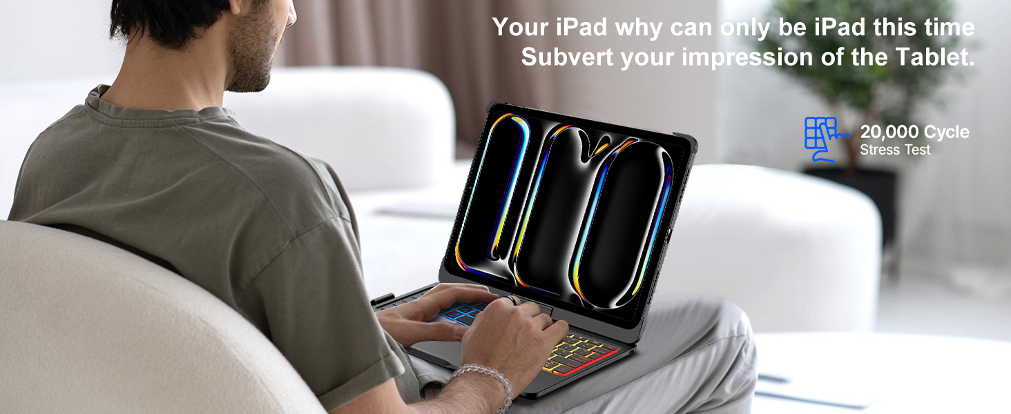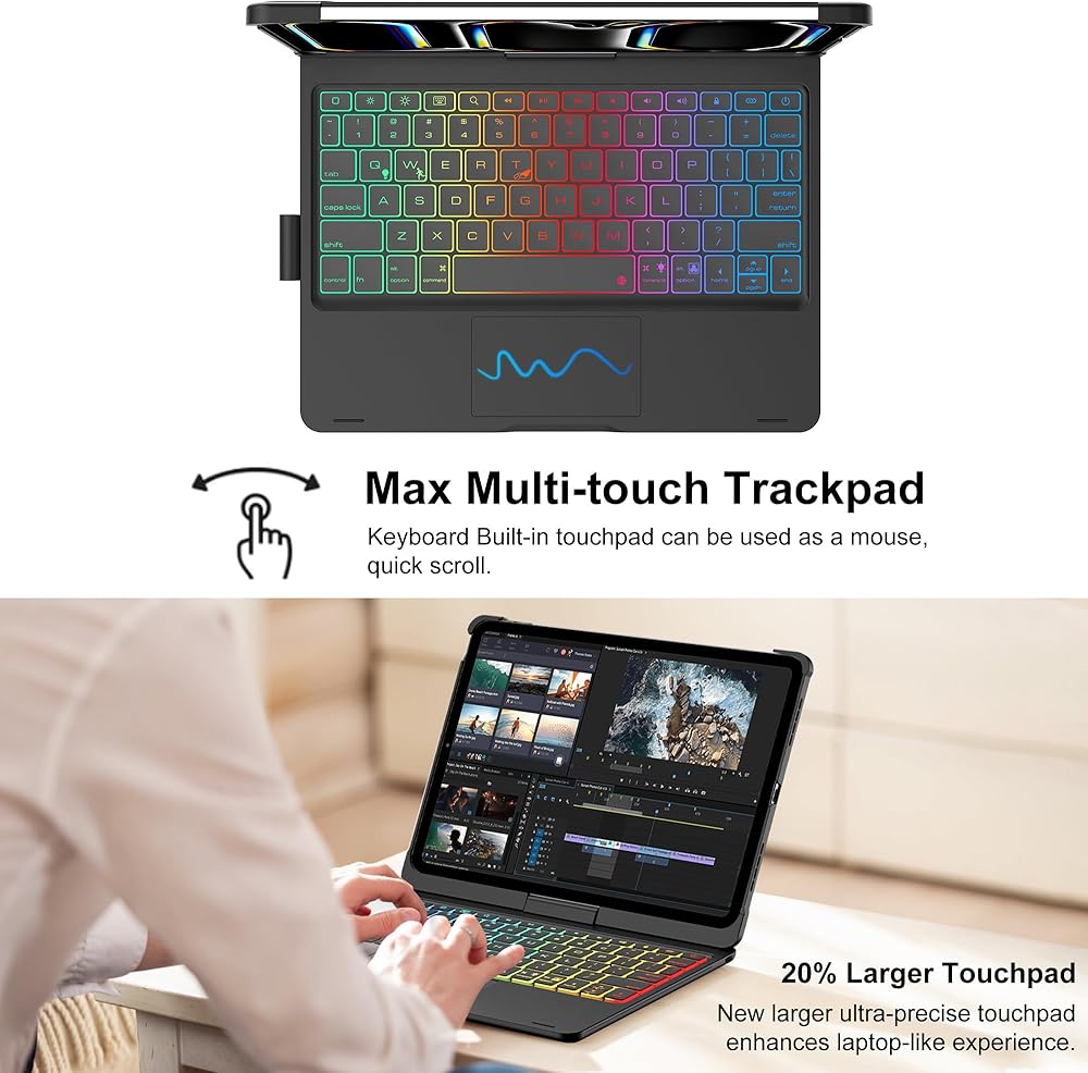 【7 أوضاع استخدام】تأتي حافظة لوحة المفاتيح لجهاز iPad Pro 13 بمفصلة 360 درجة، مما يوفر 7 أوضاع استخدام مختلفة. سواء كنت تكتب أو ترسم أو تشاهد مقاطع الفيديو أو تتصفح، يمكنك العثور على الزاوية المثالية لأي نشاط. من التعلم في الفصول الدراسية إلى المهندسين المعماريين والمهندسين الذين يديرون المهام الحاسمة إلى الفنانين والمصممين والموسيقيين الذين يعززون إبداعهم، تتكيف حافظة iPad Pro 13 هذه المزودة بلوحة مفاتيح مع أي سيناريو بسهولة.