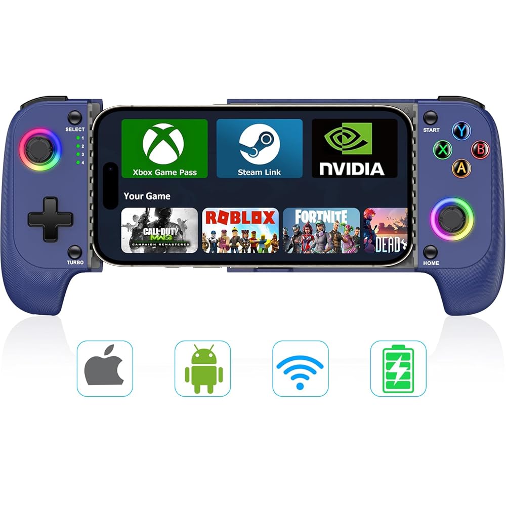 وحدة تحكم الألعاب اللاسلكية Gamtoure لأجهزة Iphone/Android مع عصا التحكم ذات تأثير Hall، رفيق الألعاب المحمولة مع تصميم RGB ومريح - مناسبة للألعاب السحابية، PUBG، Fortnite، Call of Duty Mobile