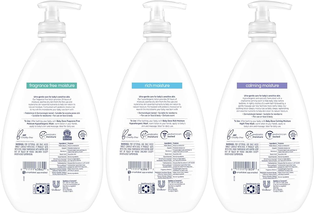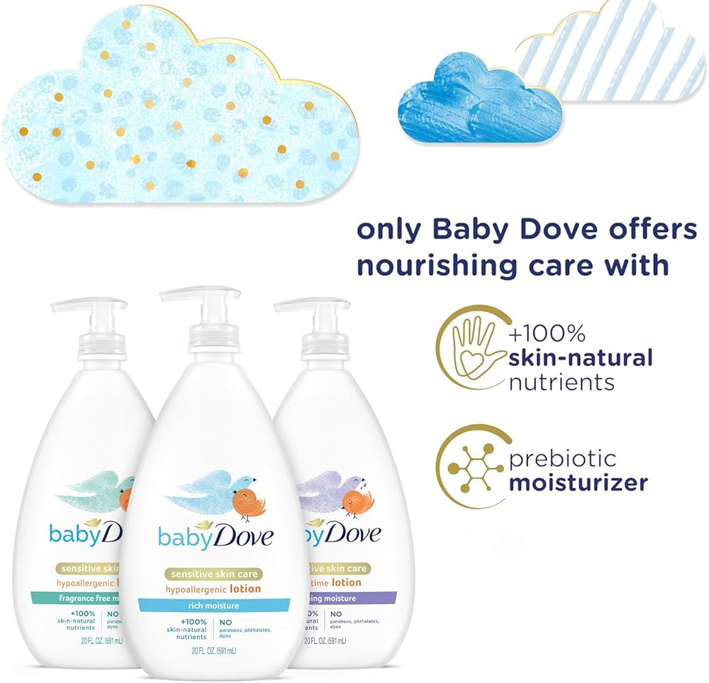 • FACE & BODY LOTION FOR BABY SKIN CARE: This hypoallergenic lotion set includes the gentle Dove lotion formula for babies in three variations: lightly scented Rich Moisture, Fragrance Free Moisture, and chamomile-scented Calming Moisture.