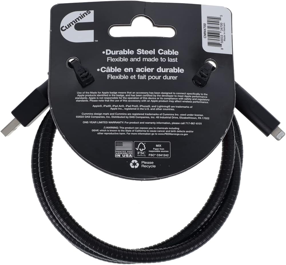 This is a convenient charging cable perfect for Cummins fans. This Lightning(R) Cable USB charging cord is MFi-certified for Apple(R) iPhone iPod iPad. The MFi-Certified rating is important because it protects your device from potential damage or harm that could come from using an unauthorized accessory. Using an MFi-certified charging cable reduces the risk of overheating or improper charging as well as port damage or even iOS inefficiencies. 3 charger cable organizers are included with your purchase to help you keep the cords where you want them and to keep them tidy when not in use. The 4ft cord is flexible to extend the life of the charging cable for use in car home or office. Durable strain relief with a gooseneck design allows the USB port to bend in any direction you like. The steel housing of this USB cord resists wear and tear and kinking. You rely on Cummins for top-notch quality plus dependability and performance. Use your devices while you are charging at the same time. Show off your pride in the Cummins name with this branded charging cable. Not intended to support the weight of a phone or tablet. A phone or tablet mount is still recommended.