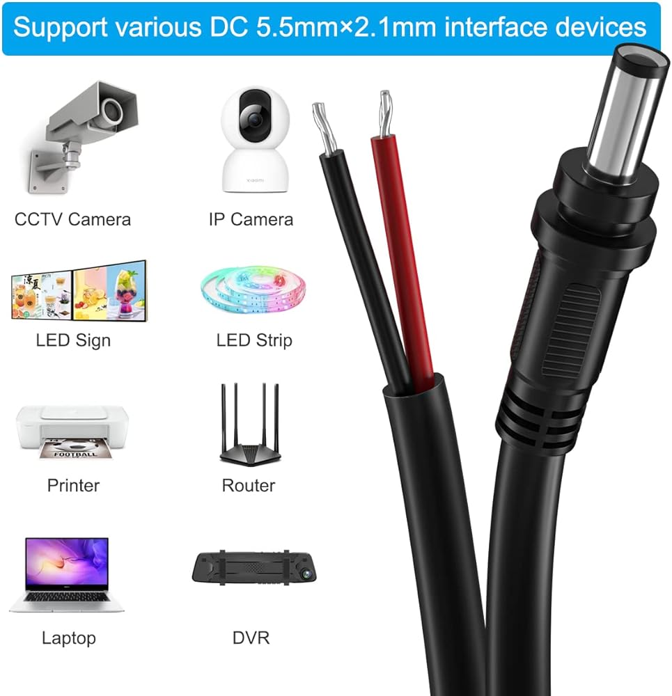 🔴 DC 5521 power supply repair cable: 5.5mm x 2.1 mm male to bare wire DC power supply repair cable is widely used for worn-out or damaged power cords, such as 12V 24V 36V DC power supply equipment,CCTV security surveillance camera systems or other application systems and more.