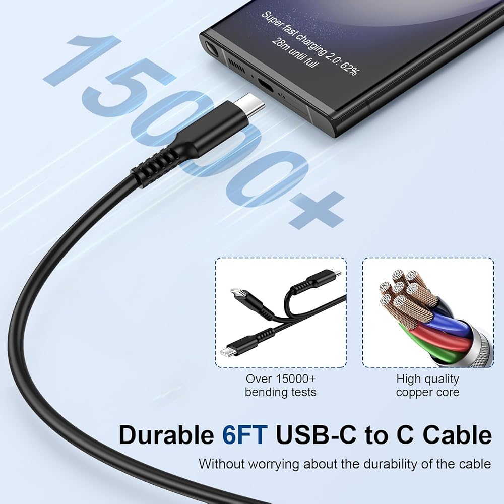 6ft(1.83m) USB C to C charging cord combined with 20W USB c power adapter let you can fast charge your Samsung S24/S23/S22/A55 A53 5G/A24 A23 5G/A15 A14 A13/Z Fold 4 5 directly, friendly reversible design, Rapid Charging at 3A Maximum, Quick connect and High-speed Data Transfer speed up to 480Mb/s helps you work efficiently.