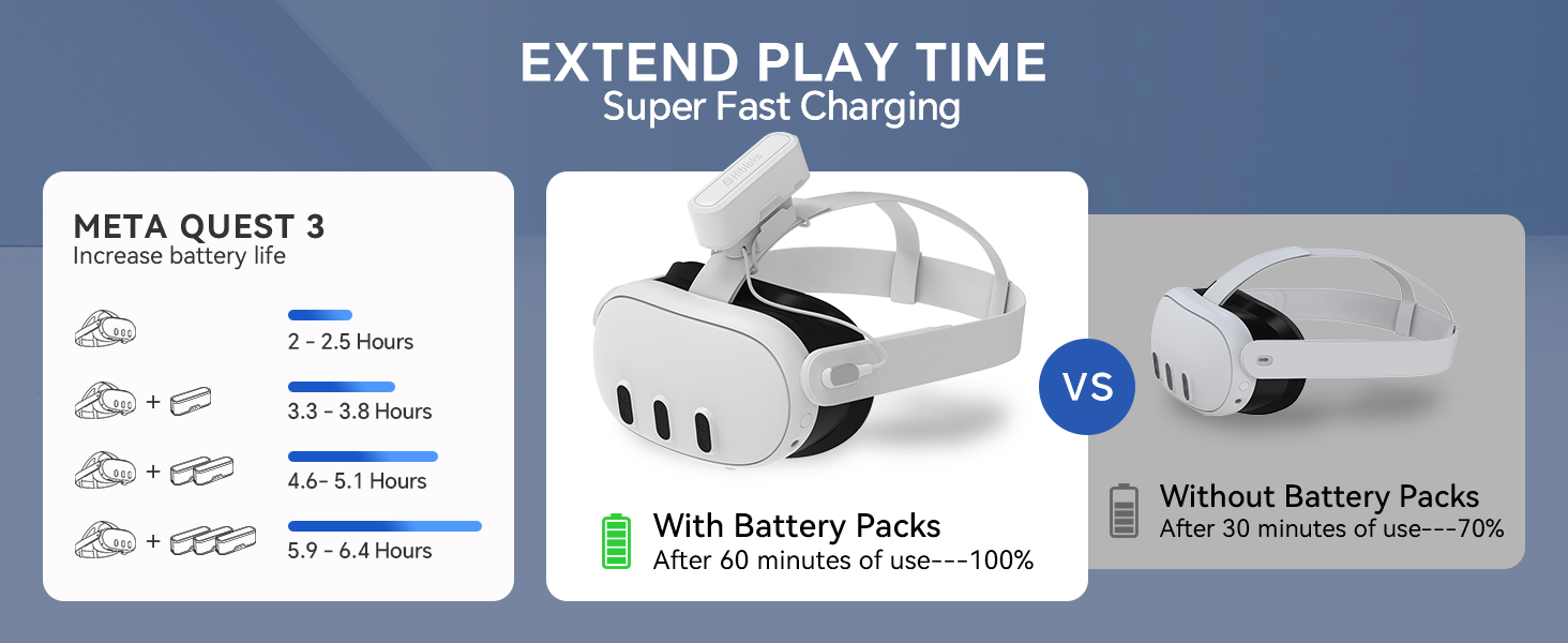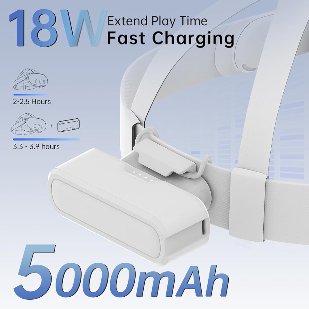 • شحن سريع 18 وات - حزمة بطارية Meta ques 3 بسعة كبيرة 5000 مللي أمبير في الساعة، شحن سريع 18 وات يسمح لك بالحفاظ على الطاقة أثناء اللعب، سماعة الواقع الافتراضي الخاصة بك تجدد الطاقة وتستمر في شحن جهازك، مما يعني أنها يمكن أن توفر لك المزيد من تجربة الألعاب الجيدة