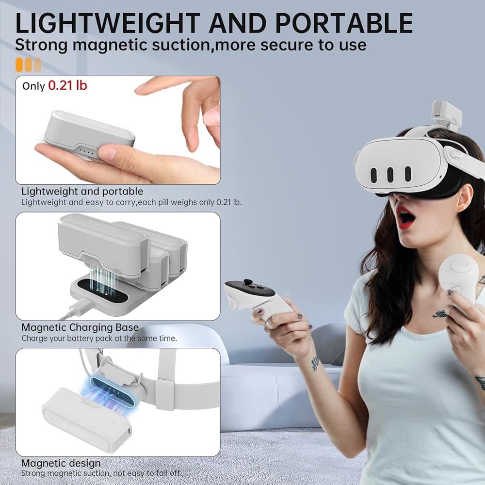 • خفيفة الوزن وقابلة للحمل - تزن حزمة البطارية 99 جرامًا فقط، وهي خفيفة الوزن للغاية، مما يضمن أنك لن تشعر بالثقل عند الاستمتاع بمتعة الواقع الافتراضي أثناء التنقل.