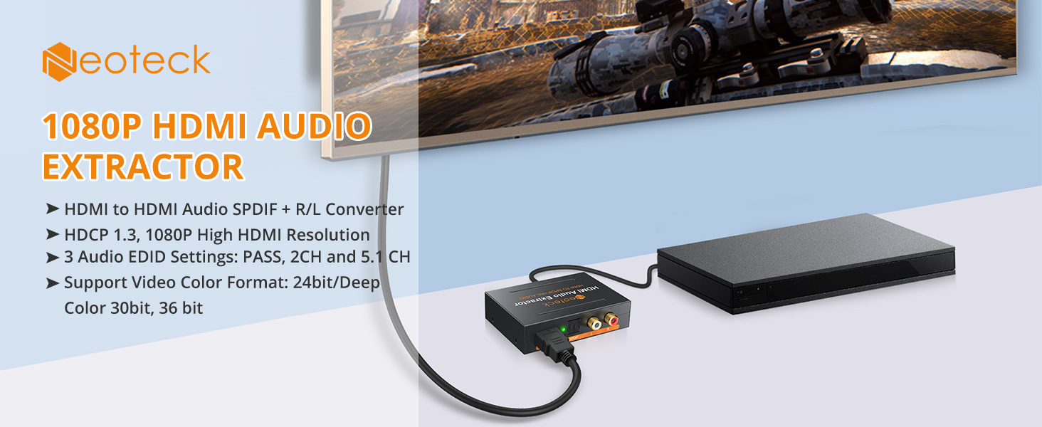 【مستخرج صوت HDMI 1080P】 محول HDMI إلى HDMI Audio SPDIF+ R/L، يسمح بمصدر HD متصل بشاشة HD واحدة ويضيف منفذ إخراج صوت L+R وSPDIF إضافي