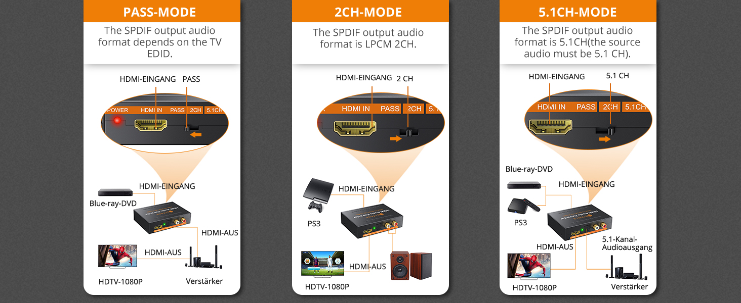 【3 إعدادات صوت EDID】 مع تمرير، 2CH، 5.1CH ثلاثة خيارات لوضع الصوت، مخرج RCA التناظري يدعم صوت ستيريو 2CH PCM و5.1CH رقمي؛ يدعم مخرج SPDIF 2CH PCM، و5.1CH رقمي، وصوت DTS، مما يوفر أفضل مرونة