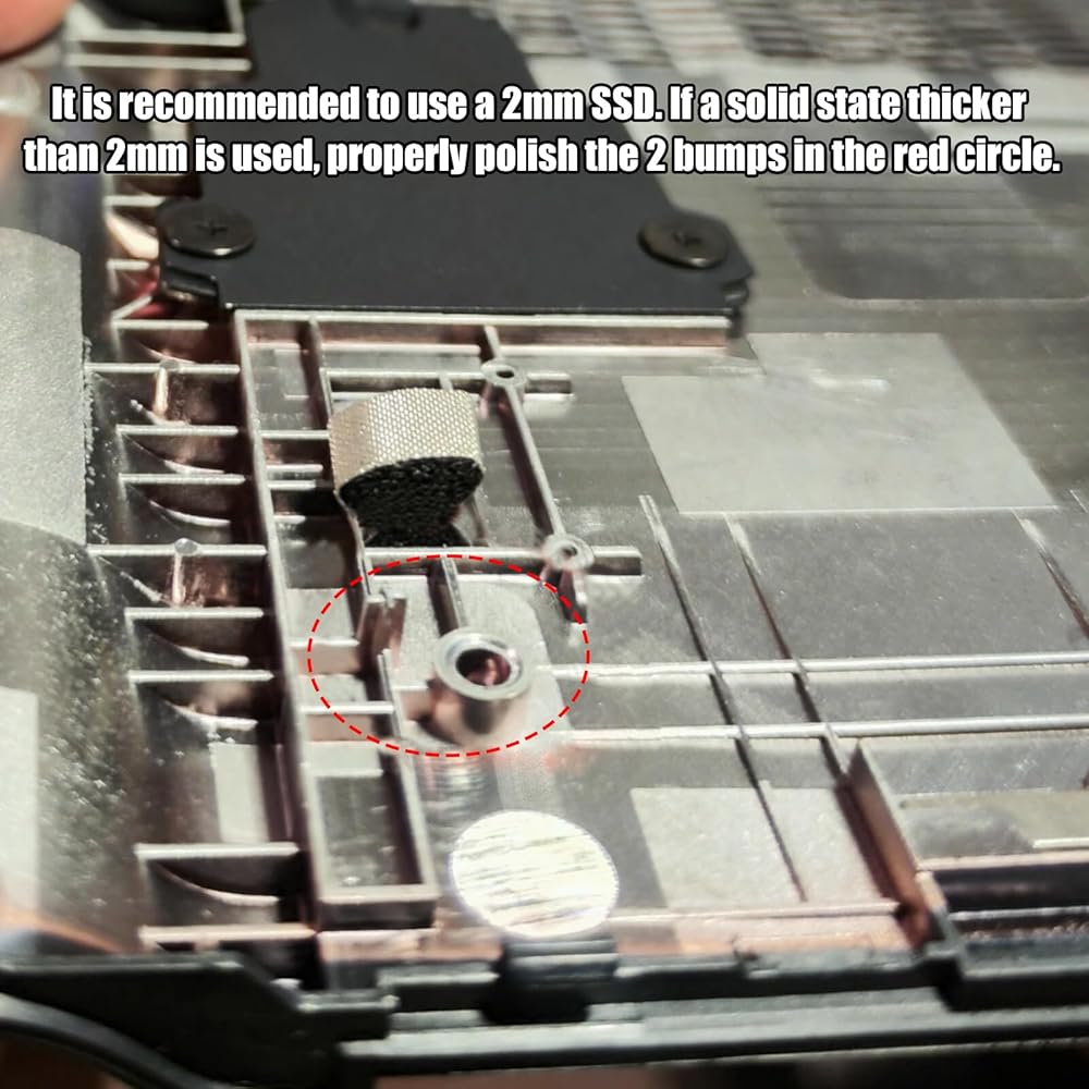 It should be noted that the use of this expansion board requires a certain degree of technical and operational skills, and it is recommended that it be installed and used under the guidance of professionals. (Please note: It is recommended to use a 2mm SSD hard drive, if you use an SSD hard drive with a thickness of more than 2mm, please polish and smooth the 2 raised positions inside the red circle on the back cover properly. (Please refer to the connection diagram).