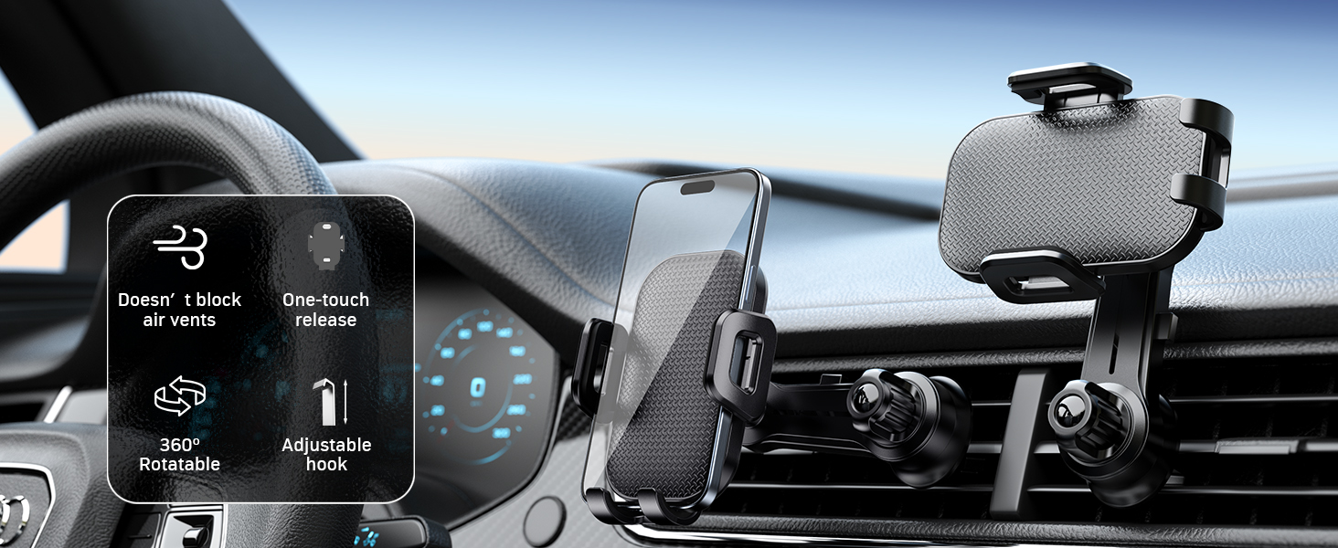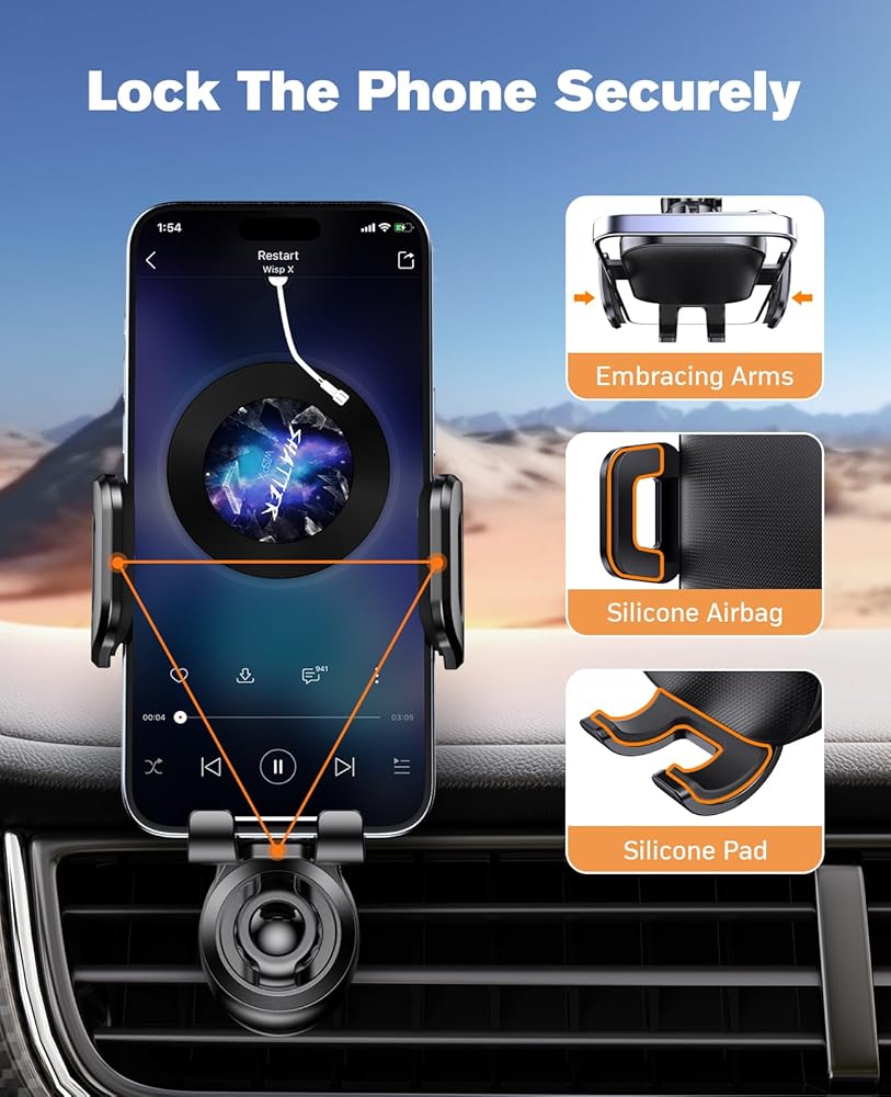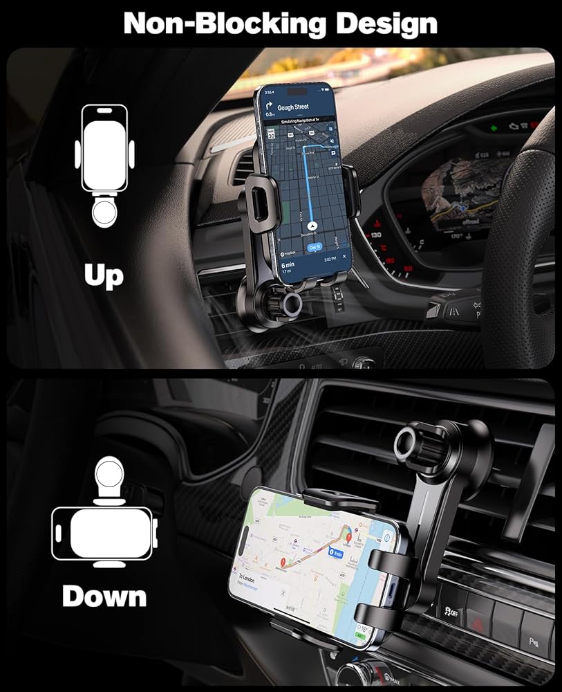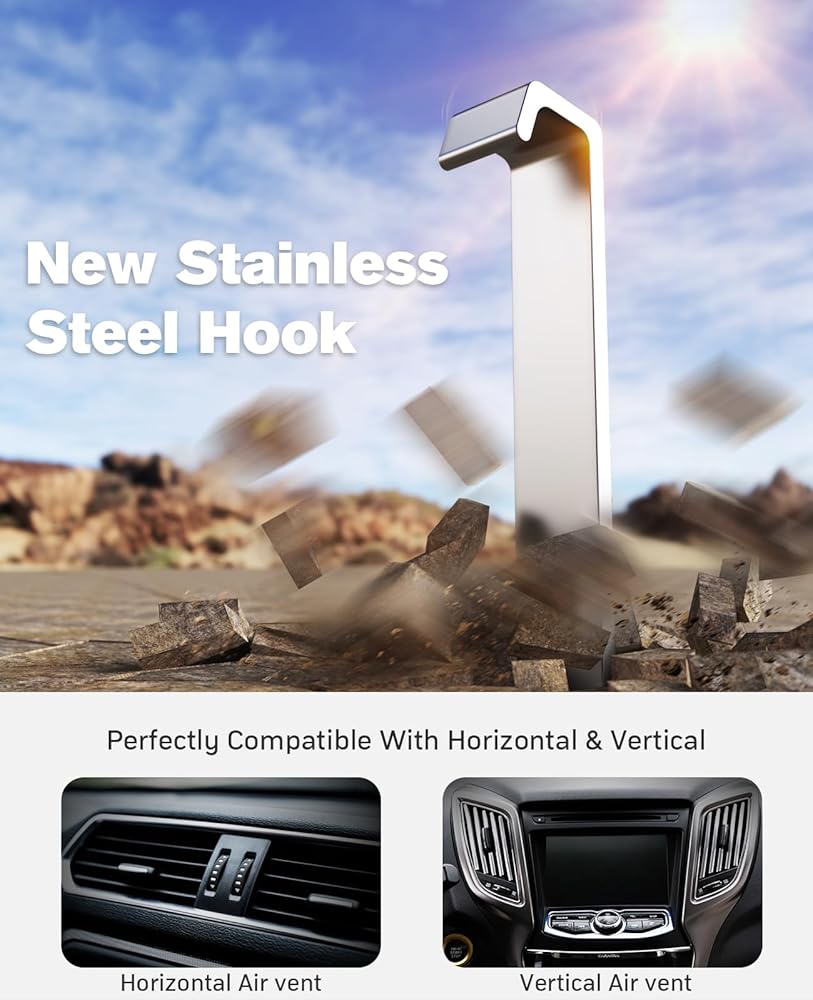 متوافق مع فتحة التهوية الأفقية والرأسية: يتميز مشبك الخطاف المصنوع من الفولاذ المقاوم للصدأ الموجود على حامل الهاتف الخلوي هذا بأقصى امتداد يبلغ 38 مم. وهو متوافق مع 99% من الفتحات الأفقية والرأسية. يتم تعليق الخطافات المعدنية المحززة بشكل آمن على شفرات وشكل فتحة التهوية. دعم ميكانيكي ثلاثي النقاط مع لوحة حاجزة، مما يوفر حماية مزدوجة للتركيب الخاص بك لتلبية جميع احتياجات فتحات سيارتك. ملحوظة: قد لا تكون الفتحات الدائرية متاحة.