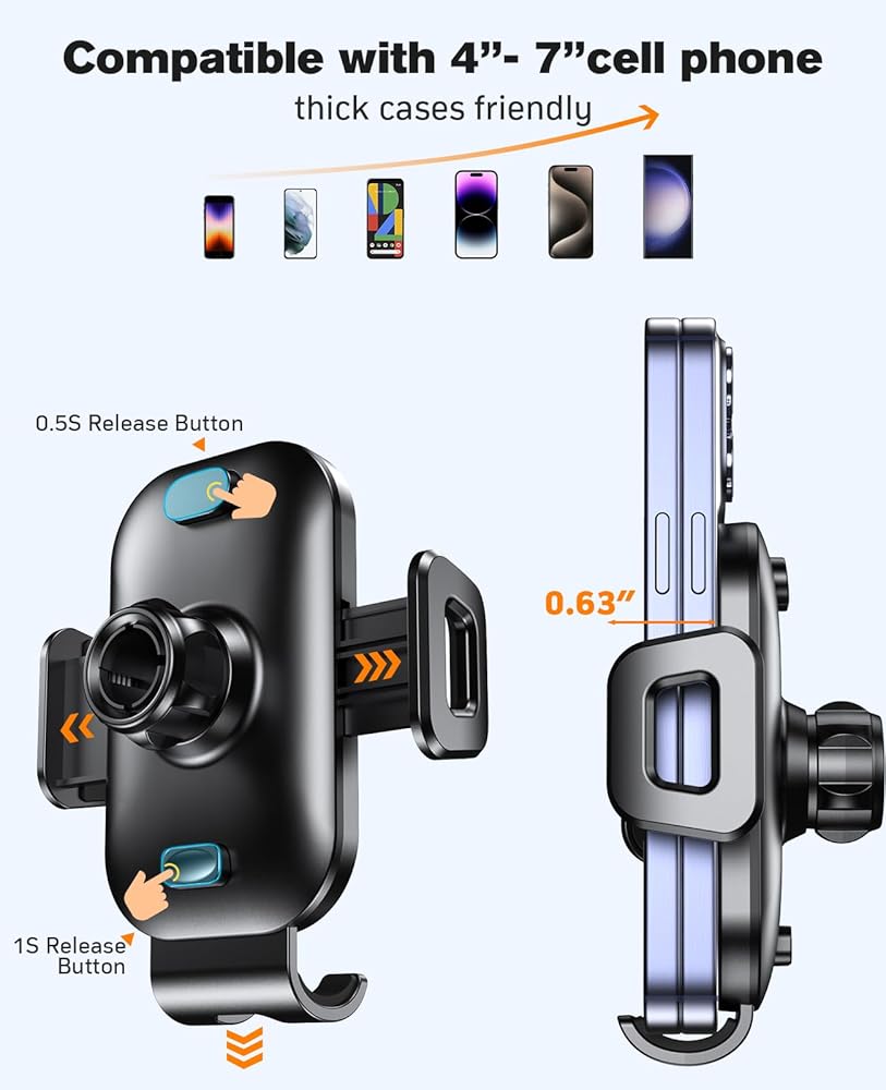 حافظة سميكة متوافقة: يستخدم حامل هاتف السيارة هذا أذرع تثبيت مطورة ووسادات مطاطية لحماية هاتفك من الخدوش، وتتميز أذرع التثبيت لحامل هاتف السيارة بأقوى قوة تثبيت، ومتوافقة تمامًا مع الجرابات السميكة، وحافظات المحفظة، وحافظات البطارية، مما يوفر ثباتًا أفضل وحماية لهاتفك.