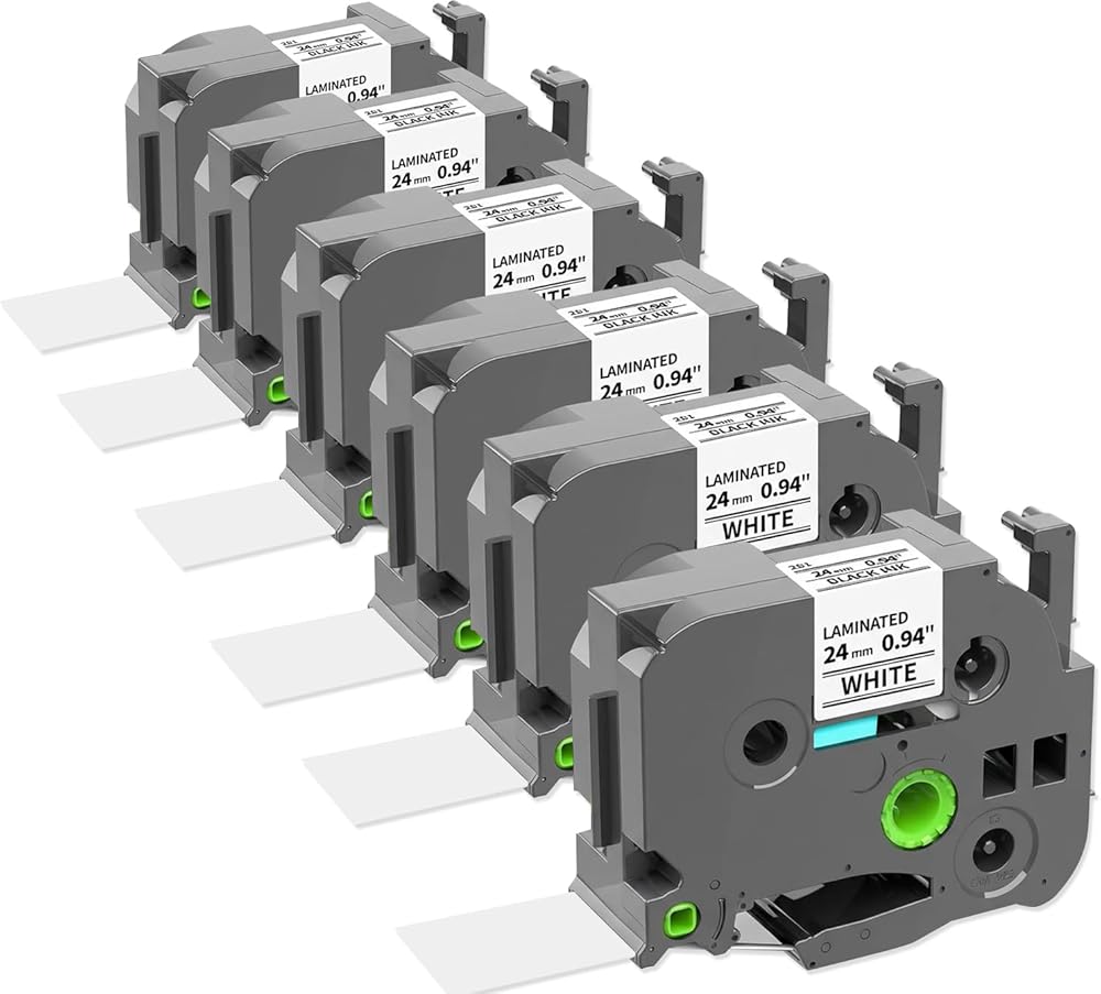 - الحجم: العرض 1 بوصة (24 مم) × الطول 26.2 بوصة (8 م)، متوافق مع شريط الملصقات Brother P Touch 24 مم