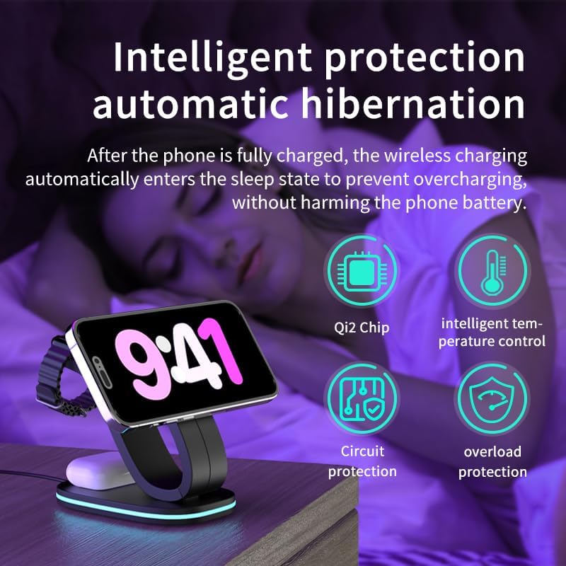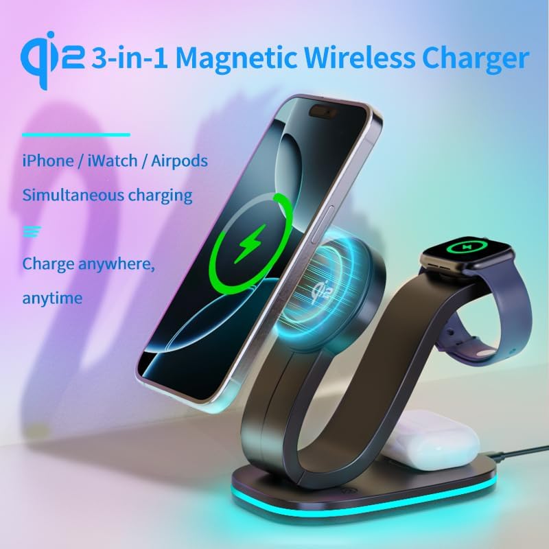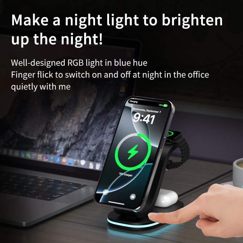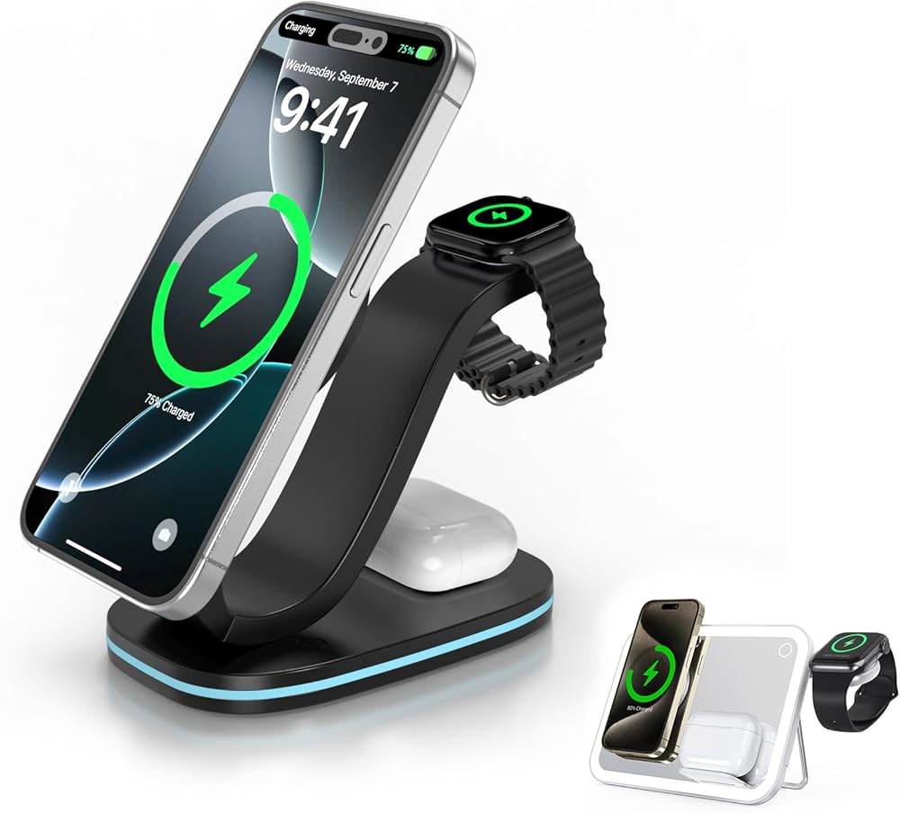 The 3 in 1 foldable charging station compatible with devices supporting PD for Apple.