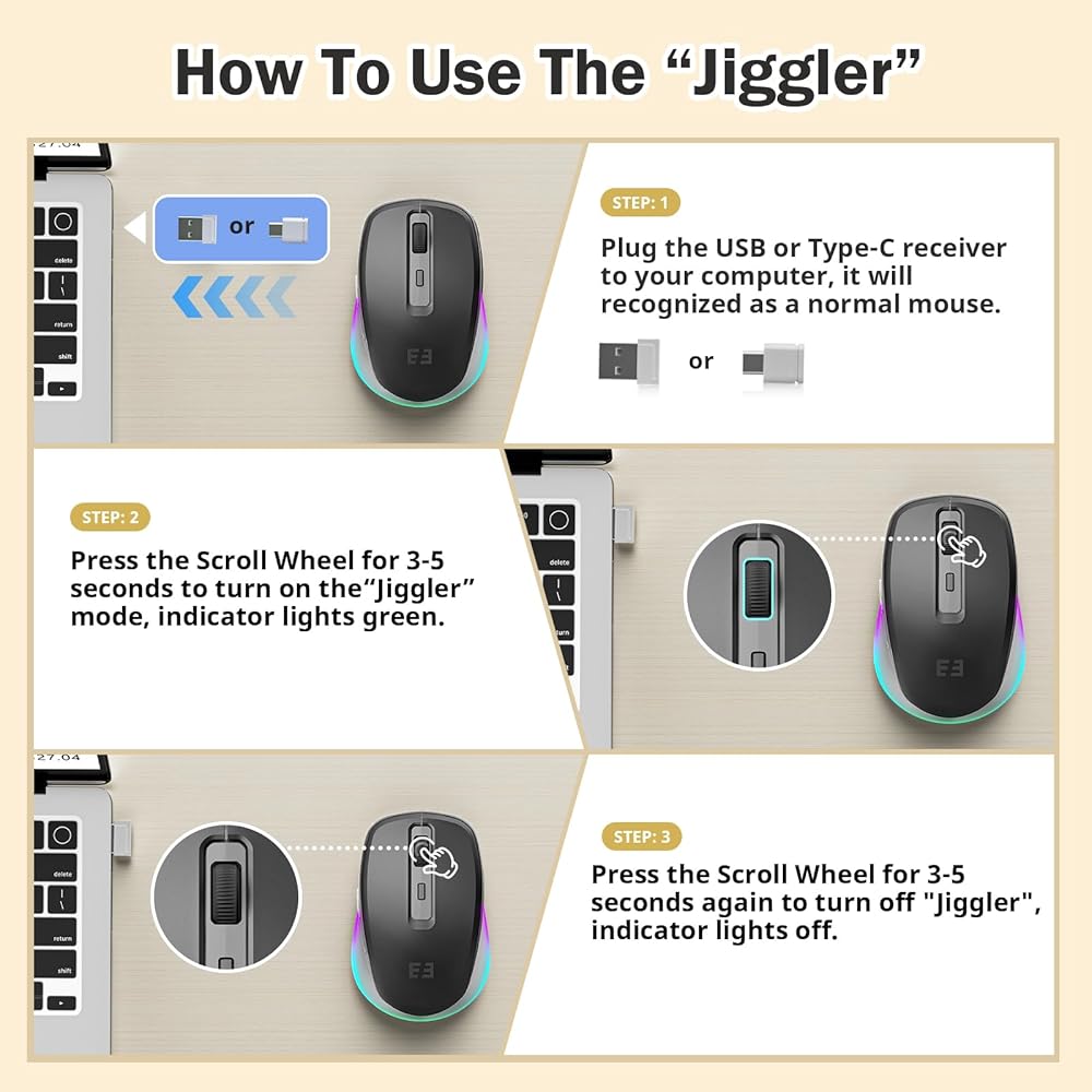 • تصميم Mouse & Jiggler Mover 2 in 1 - بالإضافة إلى كونه ماوسًا عاديًا، يتضمن هذا الماوس أيضًا ميزة "jiggler mover" المضمنة وغير القابلة للاكتشاف. وهذا يضمن بقاء جهاز الكمبيوتر الخاص بك نشطًا حتى عند الابتعاد عن محطة العمل الخاصة بك، مما يلغي الحاجة إلى إدخال كلمات المرور في كل مرة تعود فيها