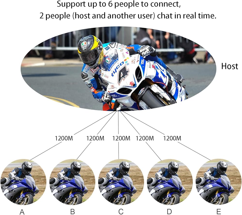 إقران 6 راكبين واتصال داخلي ثنائي الاتجاه: MIMIRACLE V6 Pro هو جهاز اتصال داخلي بلوتوث مزدوج الاتجاه للدراجات النارية. يسمح لراكبين بالتحدث في وقت واحد في نطاق اتصال داخلي أقصى يبلغ 1200 متر (بدون عوائق في خط مستقيم). وهو يدعم ما يصل إلى 6 راكبين للاتصال، بما في ذلك المضيف و5 آلات فرعية. يمكن للمضيف اختيار التحدث إلى أي واحد من الأشخاص الخمسة، وهو ما يناسب التسلق وفرق الدراجات النارية وما إلى ذلك.