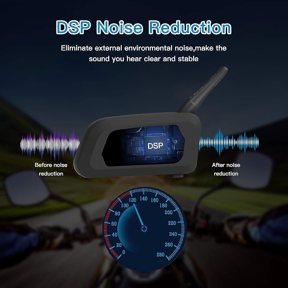 تقنية تقليل الضوضاء المتقدمة: مع تقنية إلغاء الضوضاء DSP المحسنة ورقاقة CSR المدمجة، فإنها تقلل من ضوضاء الرياح المحيطة والخلفية. يُسمح لك بالاستمتاع بصوت استريو Bluetooth بجودة صوت عالية الوضوح أثناء الركوب بسرعة عالية.