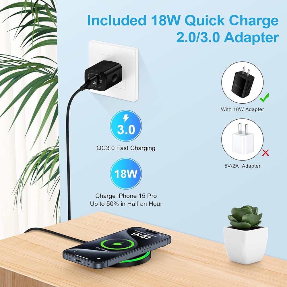 15W Quick Charge Cordless Flat Charger with QC3.0 Adapter