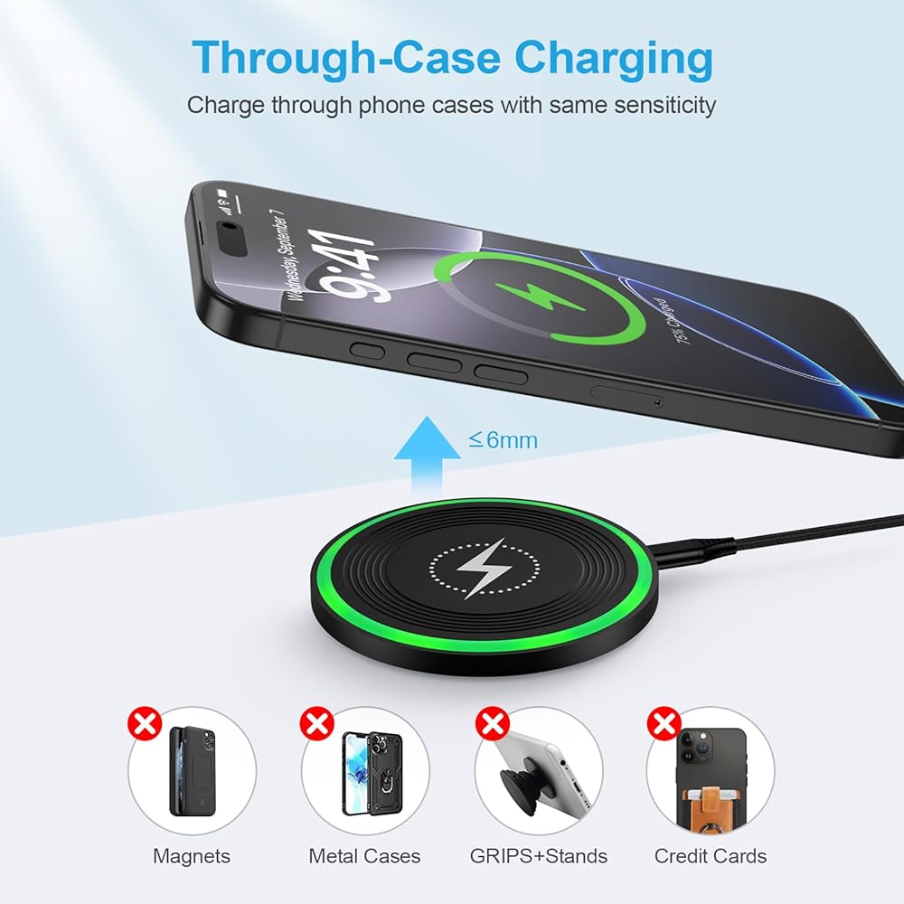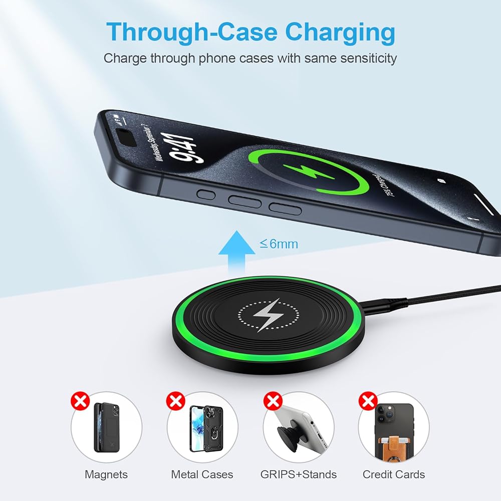 Works with rubber, plastic, and TPU cases up to 6mm thick. Metal cases and attachments like pop sockets, metal rings, magnets, and cards will interfere with charging.