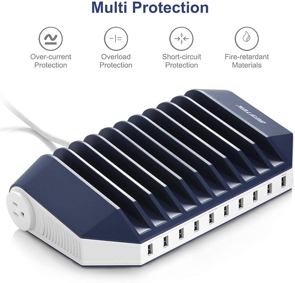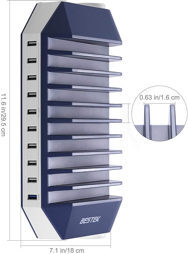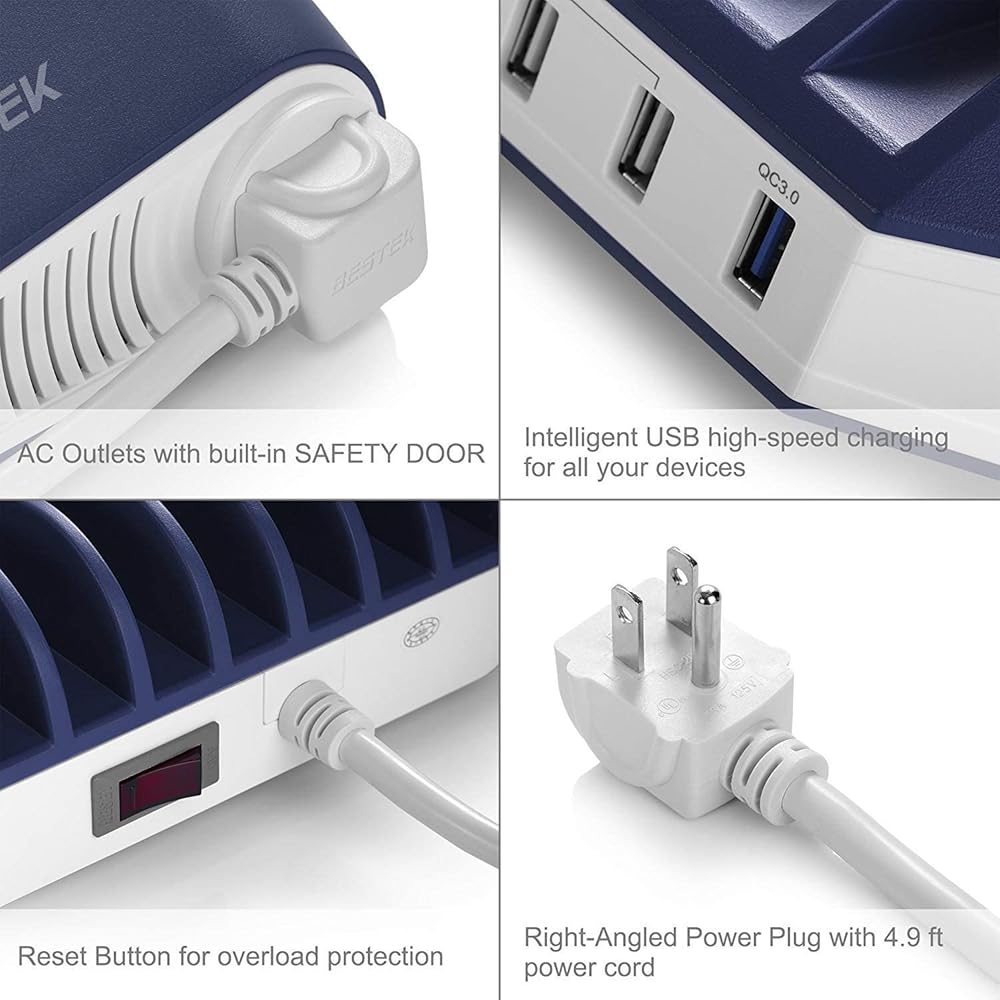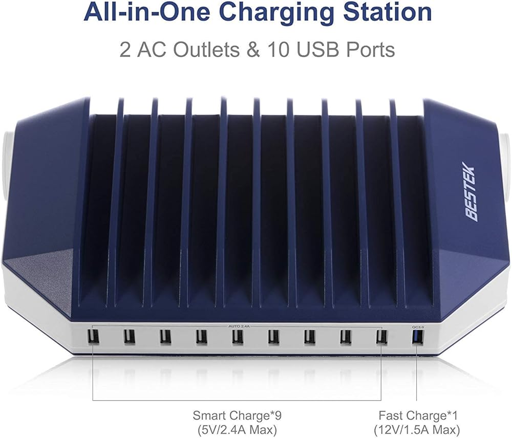 توافق واسع: محطة شحن BESTEK مع 10 منافذ شحن USB (66 وات)، مناسبة لجميع الأجهزة التي تعمل بالطاقة USB، شريحة IC الذكية المدمجة تكتشف جهازك، وتوفر أقصى سرعة شحن آمنة (شحن أسرع، لا يوجد سؤال حول التوافق)