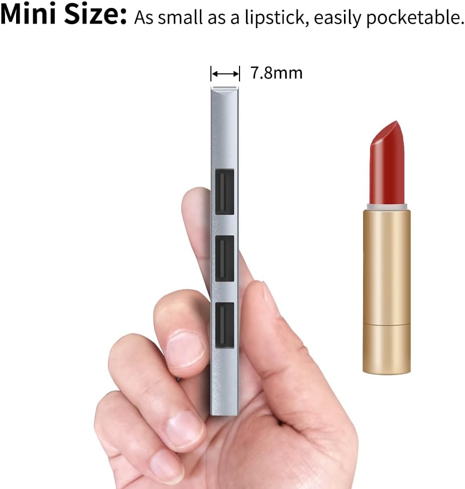 This cordless USB Hub is specially designed for laptop, which can extend 4-ports, it's slim & small, but its portable and useful. Aluminum shell make it sturdy and durable, and great for heat dissipation. It's plug & play, compatible with Windows PC, Mac, and more. A lipstick size is easy to carry, and friendly customer service make sure no worry to buy.