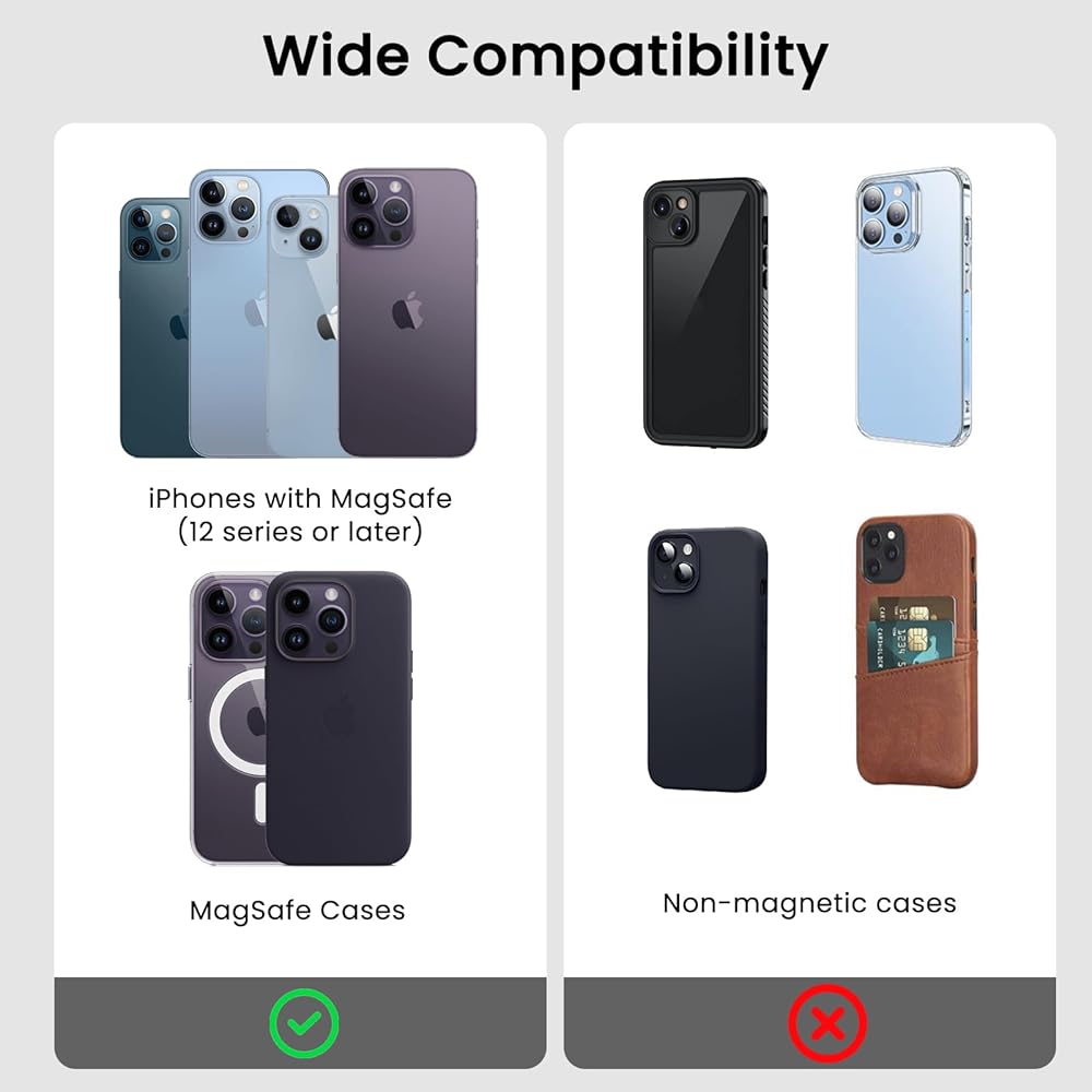 【قوة مغناطيسية قوية ولا يوجد تأثير في الشحن】تضمن المغناطيسات المدمجة مع قوة الشفط المطورة 2.8 رطل (1300 جم) تثبيتًا آمنًا بالظهر لسلسلة iPhone 15 14/13/12 بدون حافظة، مما يمنع السقوط والانزلاق العرضي. يمكنك أيضًا الاستمتاع بالتوصيل التلقائي الفوري والفصل بسهولة حسب الرغبة للشحن اللاسلكي دون ترك أي بقايا لزجة.