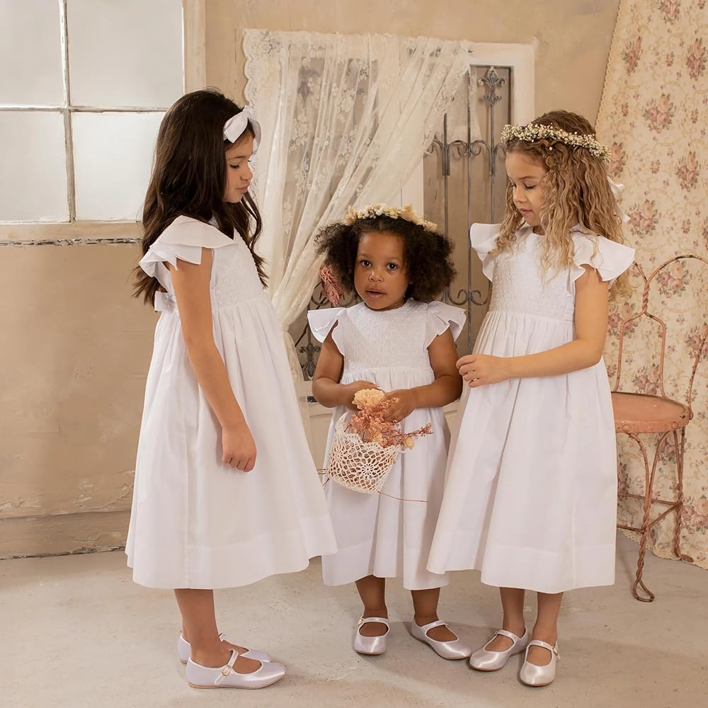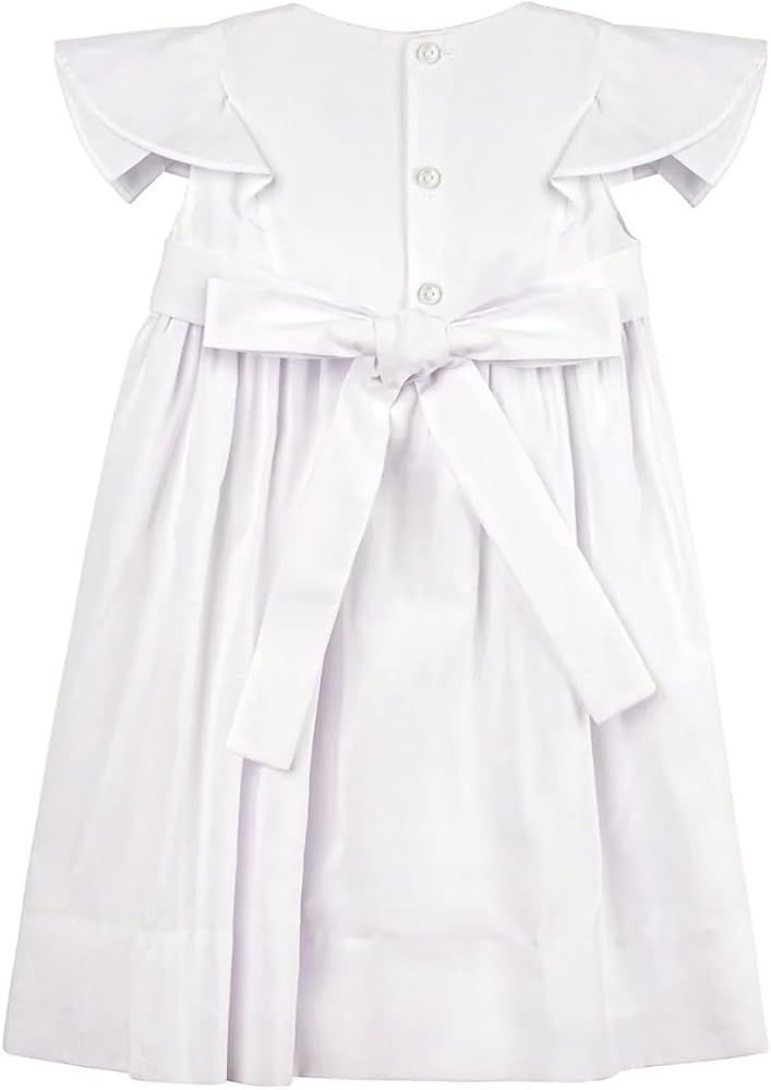 Looking for a wedding outfit for your little girl? This elegant, classic wedding dress is perfect for flower girls, family of the bride and groom, or any wedding guest who needs to look their best! Made with elegant smocking and hand embroidery, fly sleeves, and a sash tying in the back. Available in sizes 12m up to 8y! Fabric is 65% Poly, 35% Cotton and it is Machine washable.