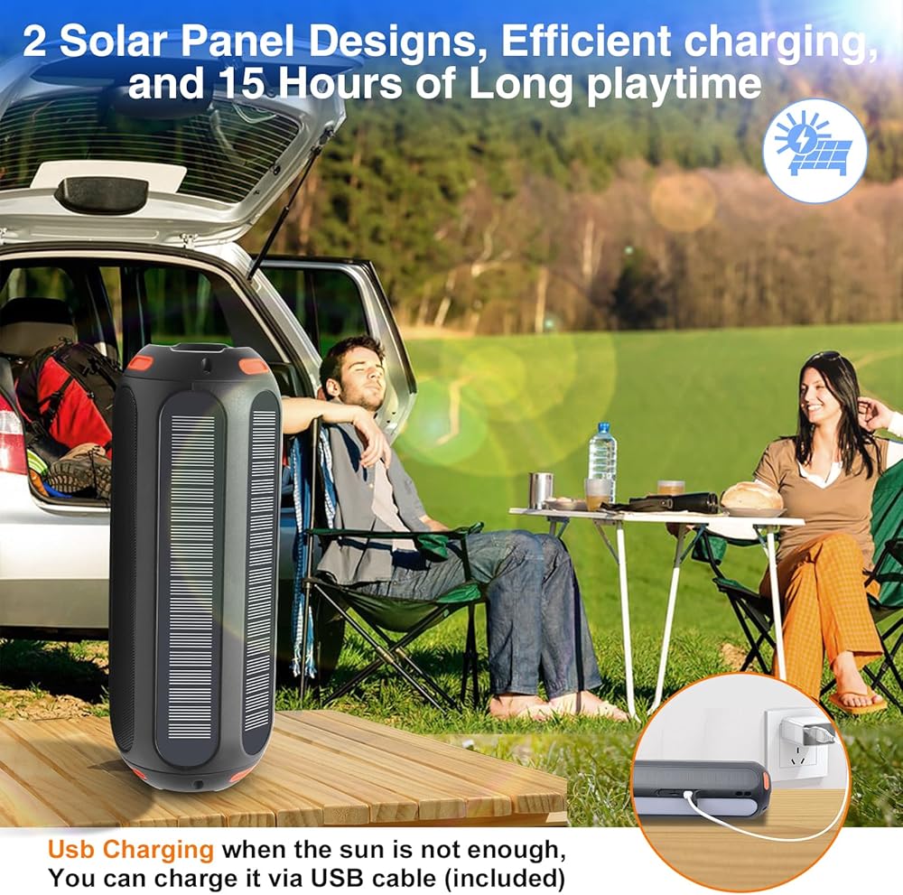 عمر بطارية 15 ساعة + شحن بالطاقة الشمسية: نظام صوتي لعربة الجولف مع بطارية مدمجة بقوة 5000 مللي أمبير في الساعة، يمكن تشغيله بشكل مستمر لمدة 15 ساعة. تسمح الألواح الشمسية المزدوجة بالشحن الذاتي في الأيام المشمسة والشحن السريع من النوع C في الأيام الممطرة، مما يضمن الراحة والكفاءة.