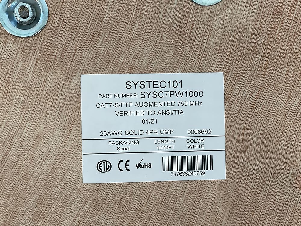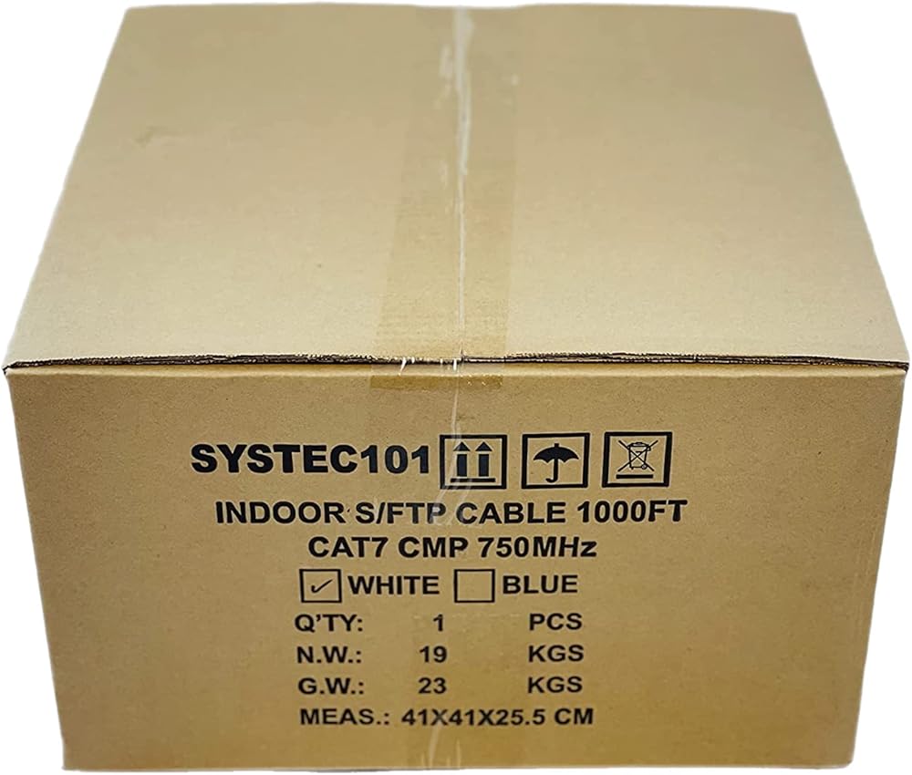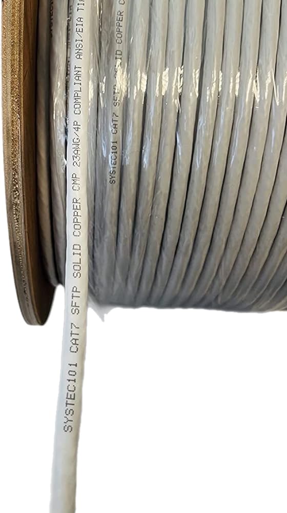 Experience the next generation of networking with Cat7 bulk cable from SYSTEC101. This cable enables 10-Gigabit data transmission over a 4-connector twisted-pair copper cable, allowing connection distances of up to 100 meters. It also proposes a new measurement for Power-Sum Alien Crosstalk to 750 MHz. Alien Crosstalk is a coupled signal in a disturbed pair arising from a signal in a neighboring cable. Features: Cat7 BLUE Solid Cable 23 AWG Copper Conductors 750 MHz Shielded twisted pair (S/FTP) cable Overall Copper Braiding CM rated Plenum Rated Jacket Supplied on 1000´ wooden spools Note: Cable comes in Blue and white.