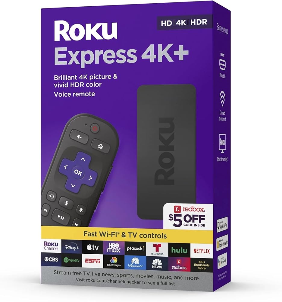 روكو اكسبريس 4K+ | جهاز بث HD/4K/HDR مع جهاز تحكم صوتي، وأدوات تحكم في التلفزيون، وشبكة Wi-Fi سريعة، وكابل HDMI ممتاز، وإعداد سهل