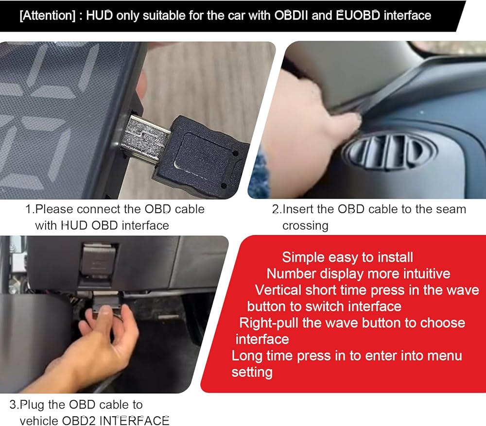 3. توافق HUD: وضع obd متاح فقط للسيارات المتوافقة مع اتفاقية obd2 والاتحاد الأوروبي-obd (المنطقة الأوروبية: بعد 2003 سنة، المنطقة الأخرى: بعد 2007 سنة) لا تدعم منتجات hud بروتوكول JOBD وOBDI. جهد العمل: 11 فولت ~ 18 فولت تيار مستمر (12 فولت تيار مستمر/200 مللي أمبير)