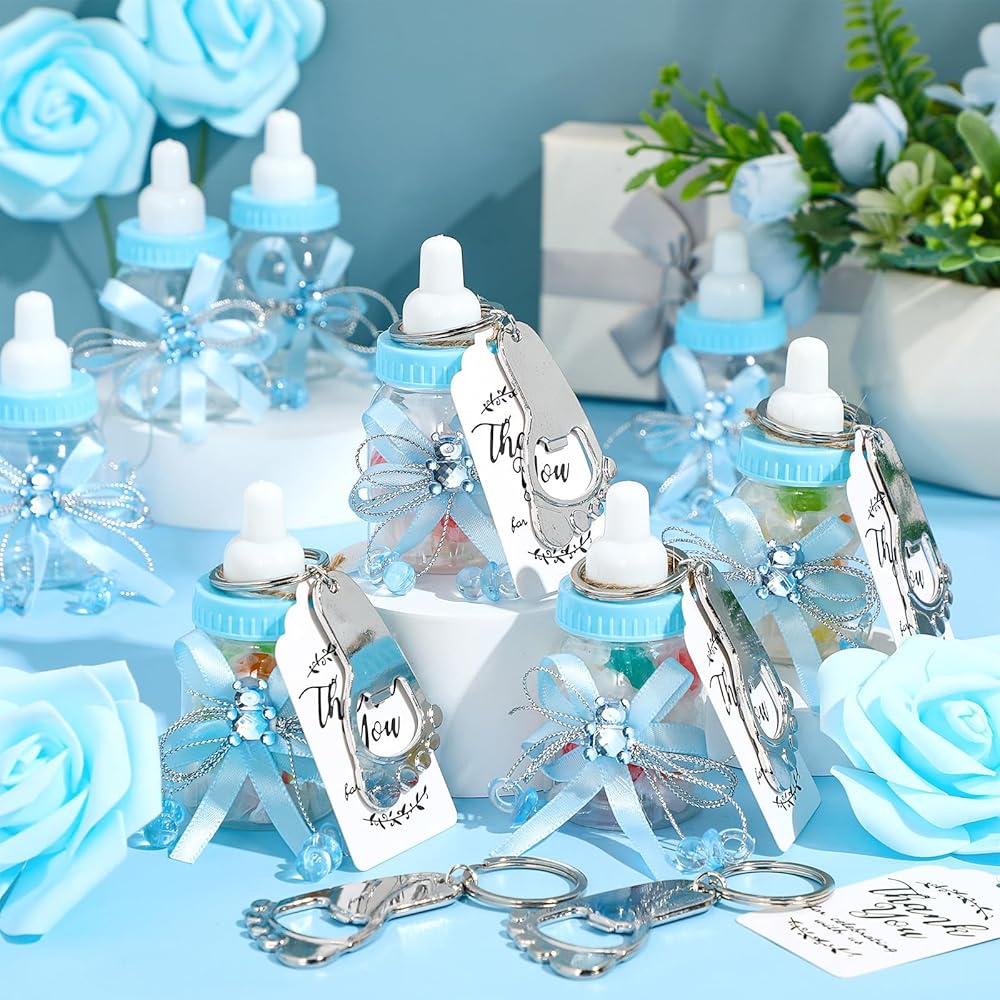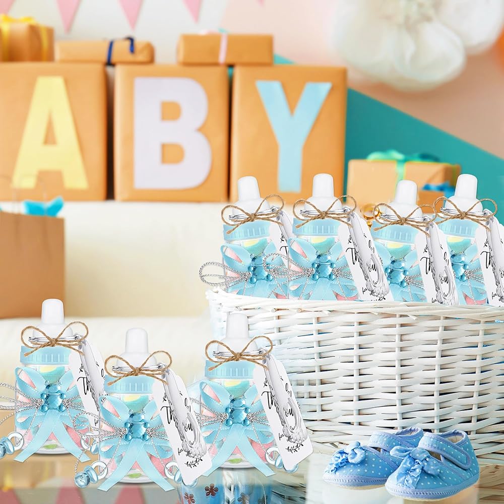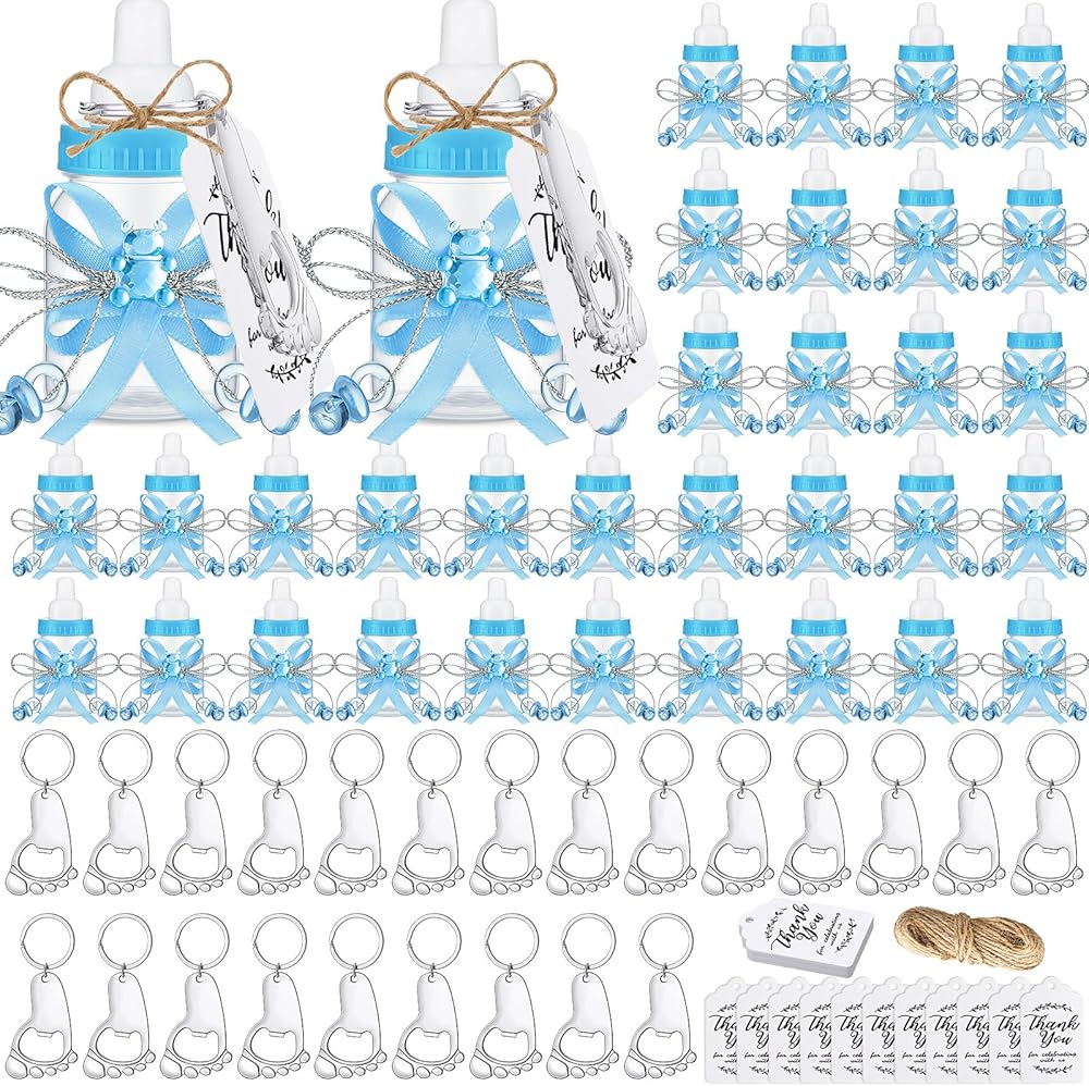 Proper Size: taking note of the little details, every item in our baby shower set is meticulously sized for your convenience; Baby shower thank you tags measure about 1.65 x 2.76 inches, ideal for writing short, personalized messages; Baby bottles measure about 3.5 inches and the footprint bottle openers are about 1.57 x 3.54 inches, a handy size to carry around or to be placed as decoration; Please confirm the size before purchasing