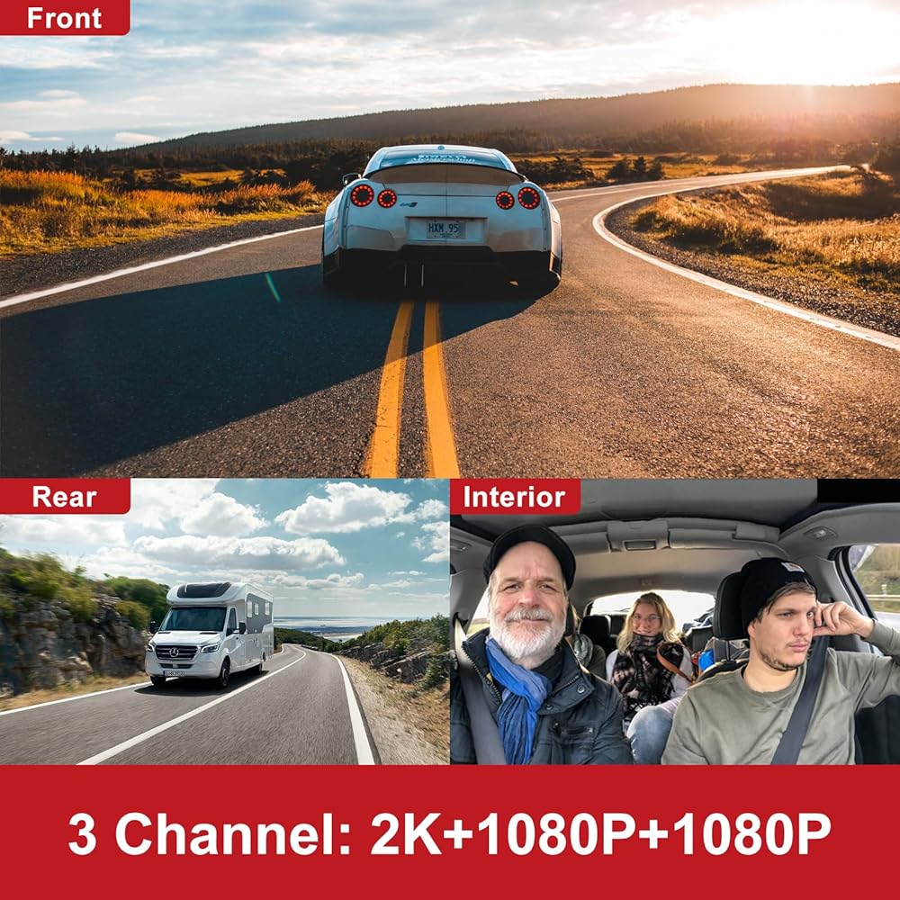 مسجل قيادة ثلاثي القنوات: مسجل قيادة مزود بنظام ثلاثي قنوات مدمج، مجهز بكاميرا أمامية بزاوية واسعة 136 درجة وكاميرا سيارة 115 درجة، بالإضافة إلى كاميرا خلفية 61 درجة، من المفيد التقاط الصور فيديو الجزء الأمامي والخلفي وداخل السيارة في نفس الوقت مصمم لحمايتك من الحوادث المحتملة وقضايا المسؤولية في المواقف غير المتوقعة مثل الاصطدامات.