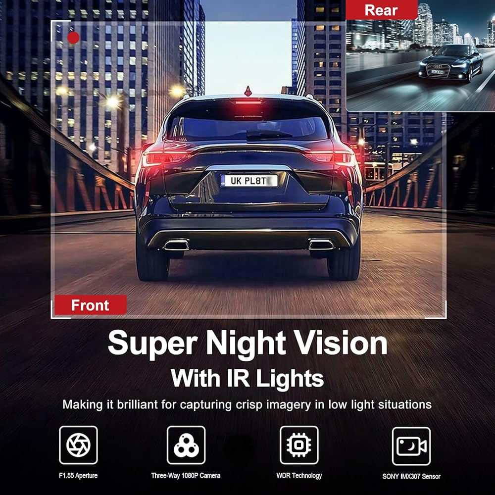 كاميرا قياس السيارة: رؤية ليلية بالأشعة تحت الحمراء فائقة وزاوية واسعة، مع فتحة F1.55 وعدسة بصرية من ست طبقات مع تقنية HDR/WDR، تساعد كاميرا السيارة على تقليل البقع العمياء من خلال أربعة مصابيح بالأشعة تحت الحمراء، حتى لو كانت السيارة المقصورة مظلمة تمامًا من خلال التقاط صور دقيقة للسائق والركاب، تلتقط الكاميرات الأمامية ذات الزاوية الواسعة (136 درجة) والخلفية (115 درجة) التفاصيل المهمة بوضوح وتوفر جودة فيديو أو صورة واضحة في ظروف الإضاءة المنخفضة.