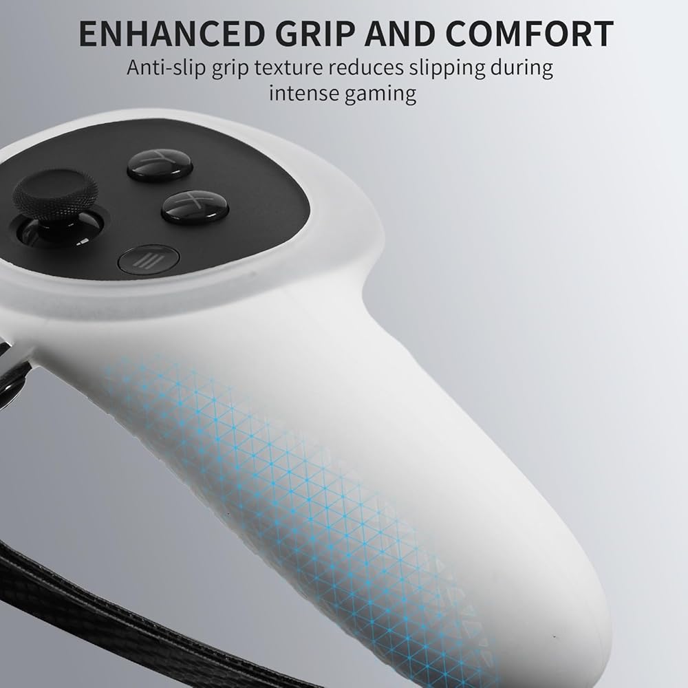 قبضة مريحة وغير قابلة للانزلاق - مناسبة لمقبض وحدة التحكم Meta Quest 3، يتميز السطح بتصميم نسيج خاص لزيادة الاحتكاك، وسيليكون عالي الجودة صديق للبشرة للتحكم بشكل أفضل في الإمساك، واستخدام مريح لفترة طويلة، وتقليل ضغط المعصم أو عدم الراحة.