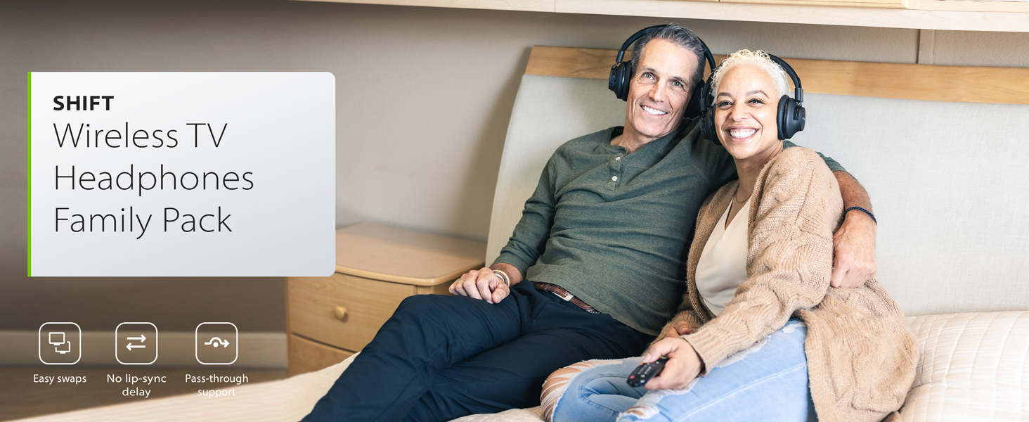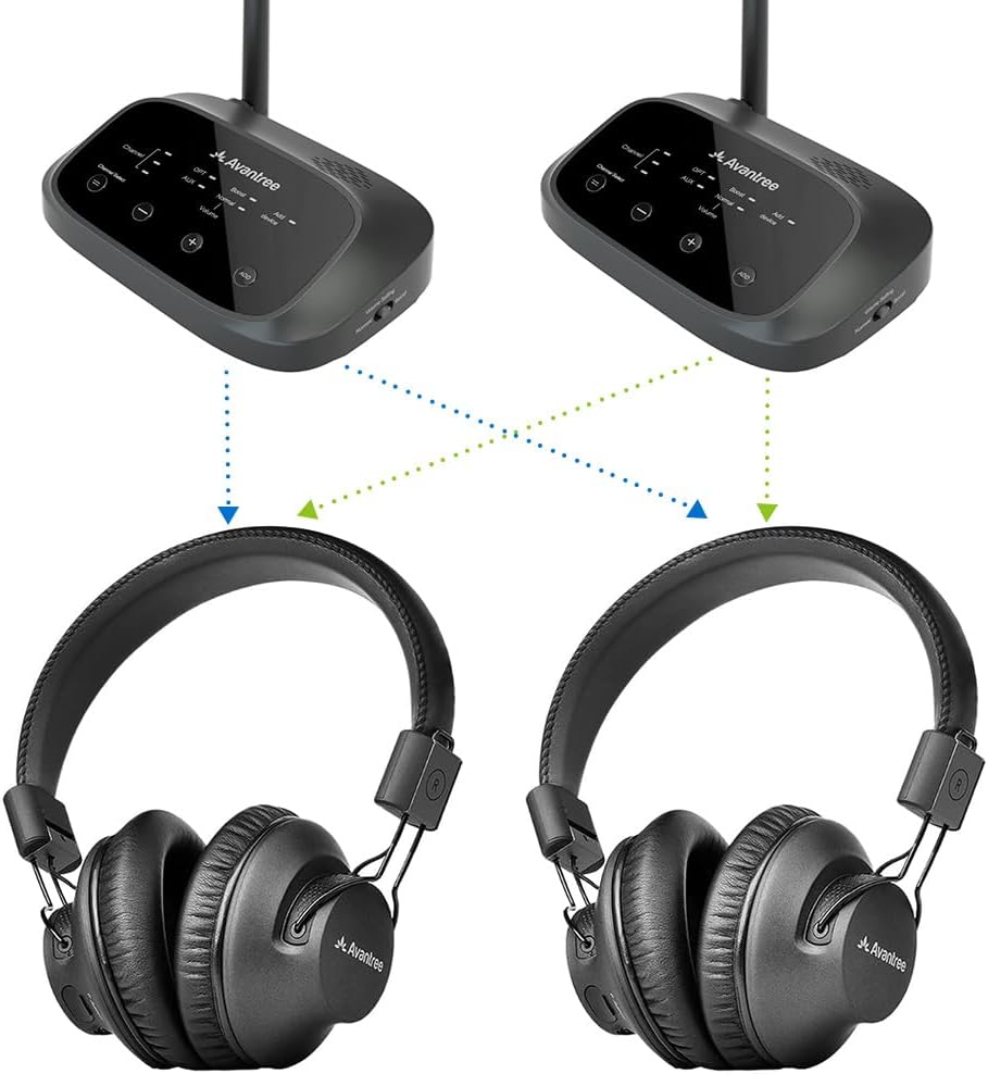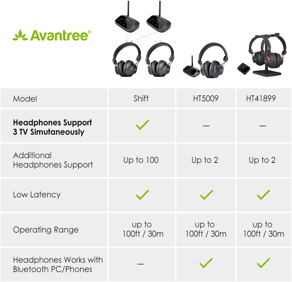 Avantree Shift - مجموعة سماعات رأس متعددة للتلفزيون اللاسلكي، مثالية لمشاهدة جهازي تلفزيون أو أكثر، مع توافق متقاطع، ومرور، وطويلة المدى، وقابلة للتطوير إلى 3 أجهزة إرسال و100 سماعة رأس