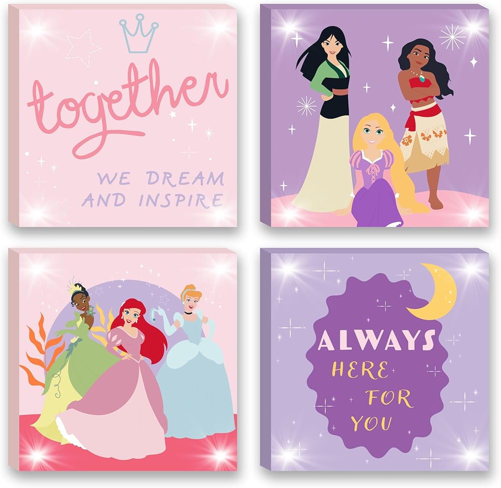 Decorate your little one's bedroom or play area with Disney Princesses 4 Pack Canvas Wall Art. It is sure to bring a smile to a child's face. This toddler wall art would be a nice addition to a themed room. Pair the canvases together or spread them around the room for a sense of cohesion. The canvases features some of your favorite Princesses such as: Cinderella, Tiana, Ariel The Little Mermaid, Rapunzel, Moana, & Mulan. It would make a nice surprise for anyone that enjoys these characters. This would be a nice touch for children who like some light when they are going to sleep. Use them as decorations at a child's birthday party.