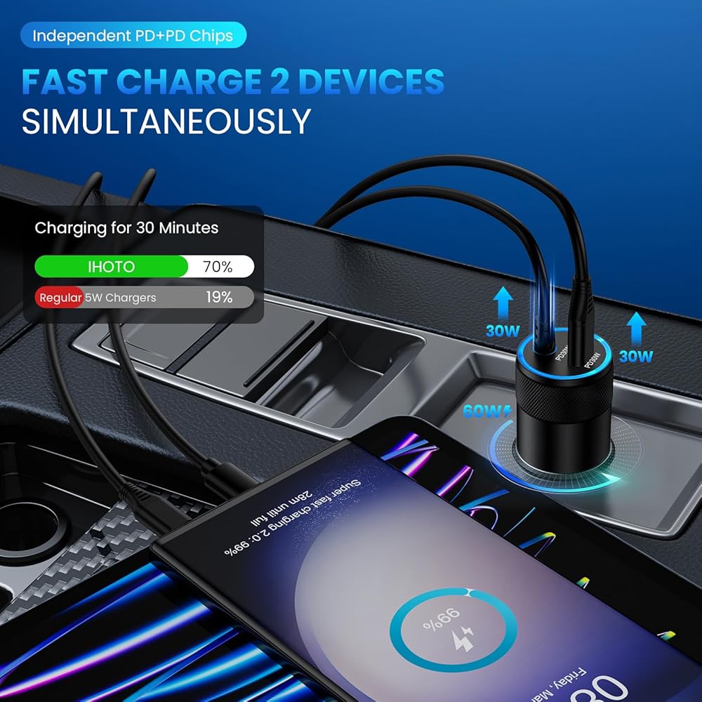 2 Port 60W Super Fast Charging USB C Samsung Car Charger Cigarette Lighter Adapter for Galaxy S24 S23 A15 A35 A55 iPhone 15 ect.