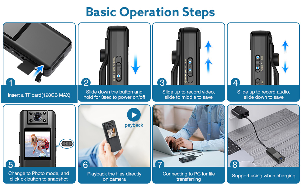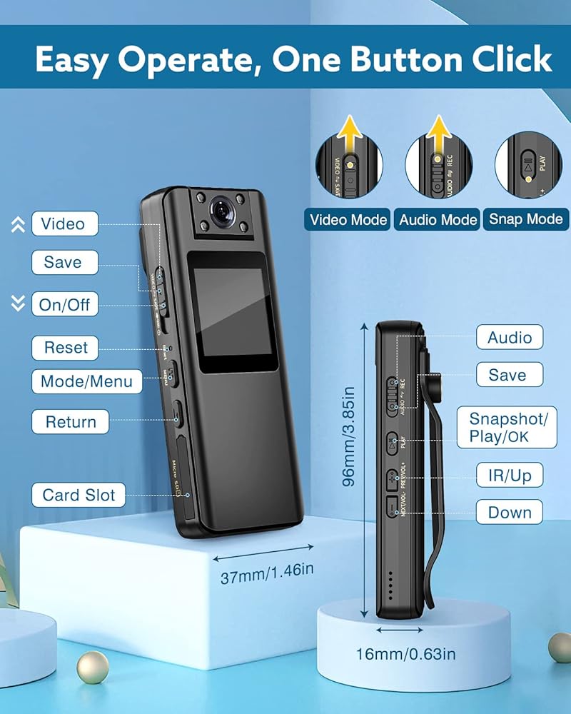 【كاميرا الجسم BOBLOV A22 مع تسجيل فيديو】تتمتع الكاميرا التي يتم ارتداؤها على الجسم بدقة فيديو 1080 بكسل في تسجيل الفيديو و40 ميجابكسل في التقاط الصور. إذا كنت تريد كاميرا قابلة للحمل ومريحة لتسجيل رحلاتك الخارجية، والسفر، وممارسة الرياضة، والحياة العملية، فيرجى إلقاء نظرة على كاميرا A22 الخاصة بنا.