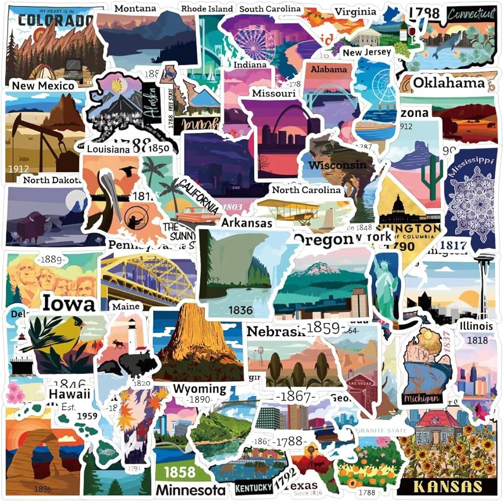 50 قطعة من ملصقات خريطة السفر في الولايات المتحدة، ملصقات فينيل مقاومة للماء لسجلات القصاصات وزجاجات المياه والكمبيوتر المحمول والجيتار والكمبيوتر والهاتف للأطفال والكبار